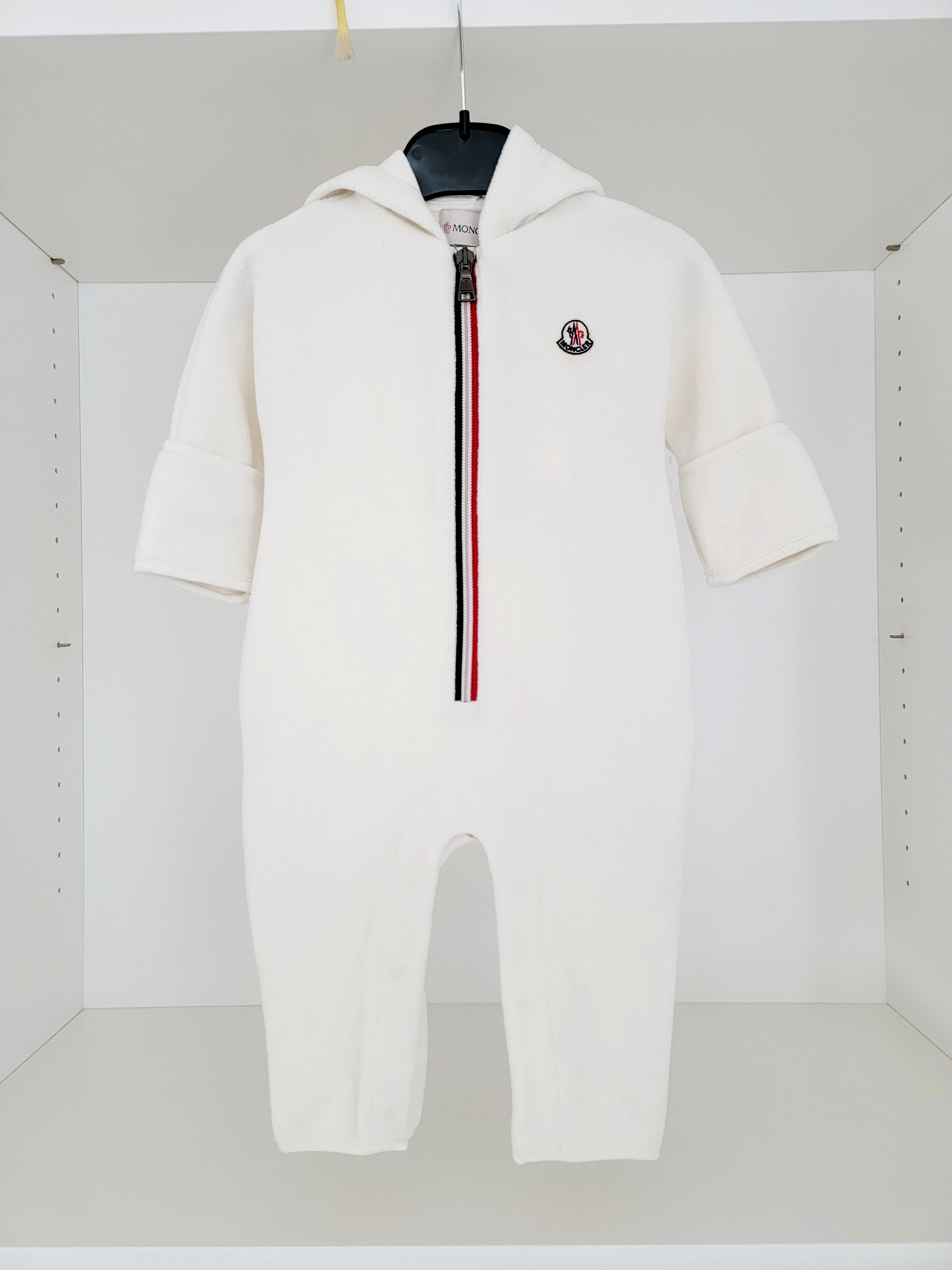 Süsser, warmer Strampler/ Overall von Moncler, neu und ungebraucht. Mit Reissverschluss und Druckknöpfen im Innenbein-Bereich für einfaches Windelwechseln. Die aufgerauhte Fleece-Qualität gibt Wärme an kalten Tagen. Neupreis 265.-
