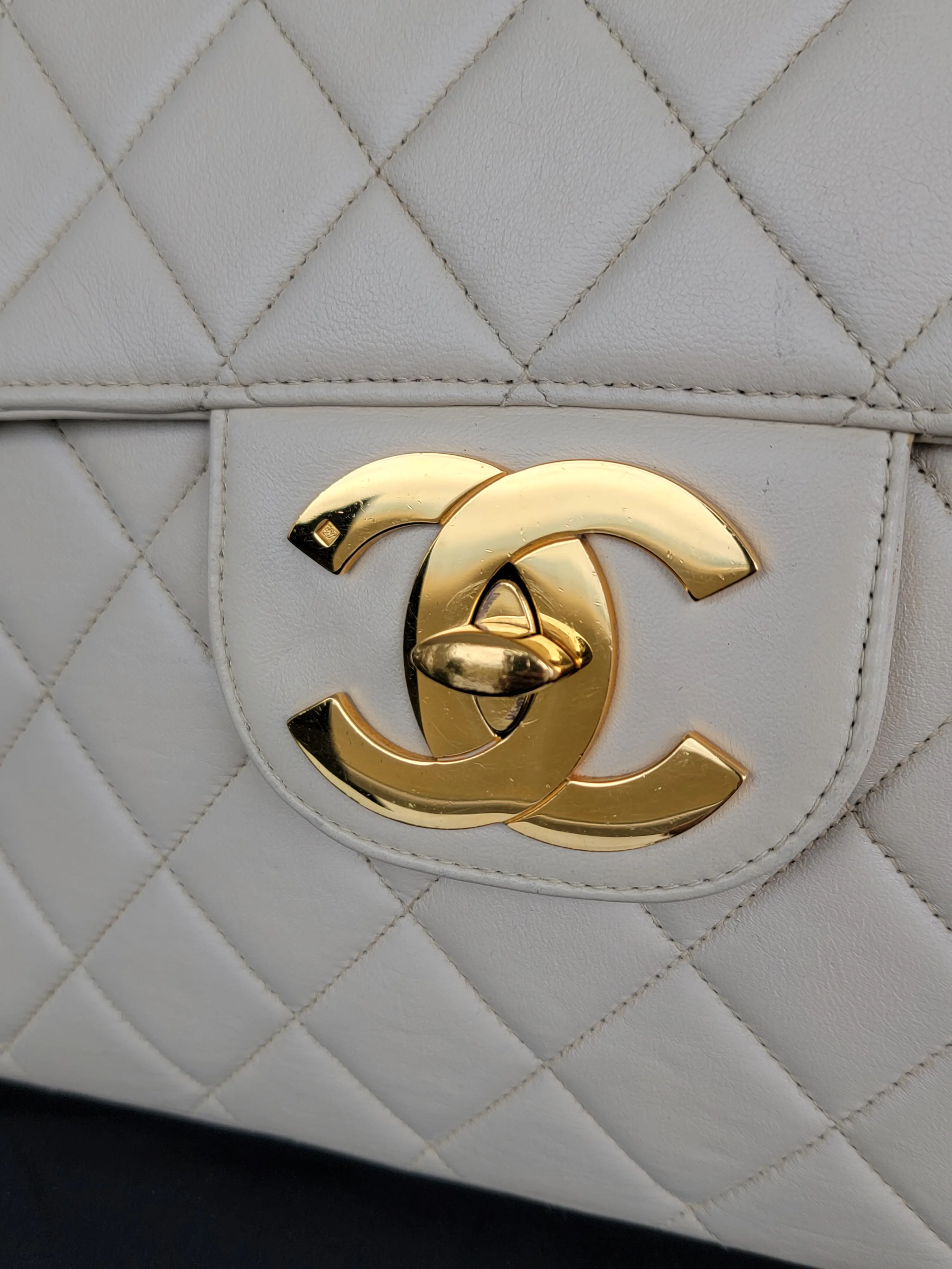 Wunderschöne Chanel Jumbo in sanftem Beigeton und 24k-vergoldeter Hardware. Sehr gepflegt, keine wesentlichen Gebrauchsspuren. Nur das Leder in der Schulterkette ist leicht verfärbt (siehe Bild). Es ist wirklich eine ausserordentlich schöne Tasche