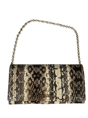 Affirm your style with this bold Jimmy Choo bag/clutch, adorned with a luxurious beige and black python print. The elegant design is enhanced by a delicate gold metal chain, allowing you to wear it on the shoulder or transform it into a chic clutch by tucking it in. Ideal for an evening out or to add a sophisticated and trendy touch to your daytime outfits.