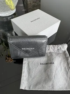 Kleines 3-fold Balenciaga Portemonnaie mit vielen Fächern. Das Leder ist vom Gebrauch weich und knittrig geworden, jedoch hat es keine Risse oder andere Mängel. Das Logo ist leicht verblasst gemäss Fotos.