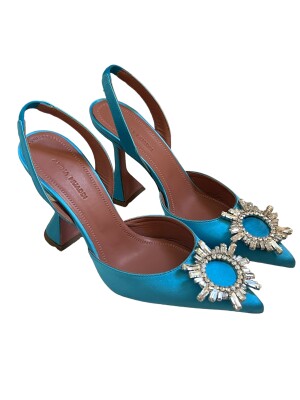These Amina Muaddi pumps are a statement piece, emblematic of the designer's bold and glamorous aesthetic. They are made of vibrant turquoise silk satin and feature a pointed toe. A large ornament of sparkling rhinestones is placed on the front of the foot, catching the light with every step. The look is completed by a thin ankle strap, ensuring a secure fit.