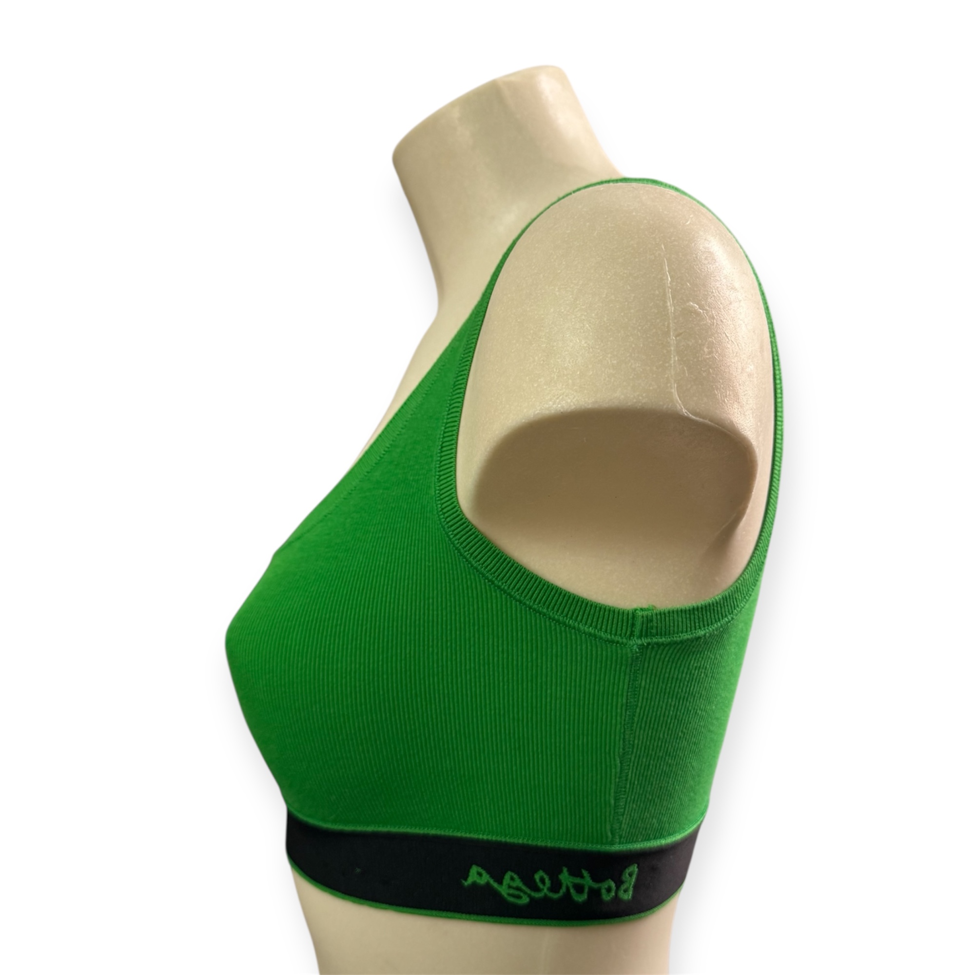 This Bottega Veneta bra stands out for its minimalist and contemporary silhouette, faithful to the clean aesthetic of the Italian house. Crafted from stretchy ribbed knit, it features an intense green hue that brings a touch of freshness and modernity to the piece. The close-fitting cut naturally hugs the silhouette, while the rounded neckline and wide straps ensure comfortable support. The contrasting lower band highlights the chest and adds a discreet graphic dimension to the whole.
