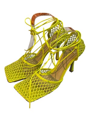 These Bottega Veneta shoes are sophisticated sandals, characterized by their neon yellow color and modern design. They feature a square toe and an openwork mesh structure. Thin leather laces go up and fasten around the ankle.
