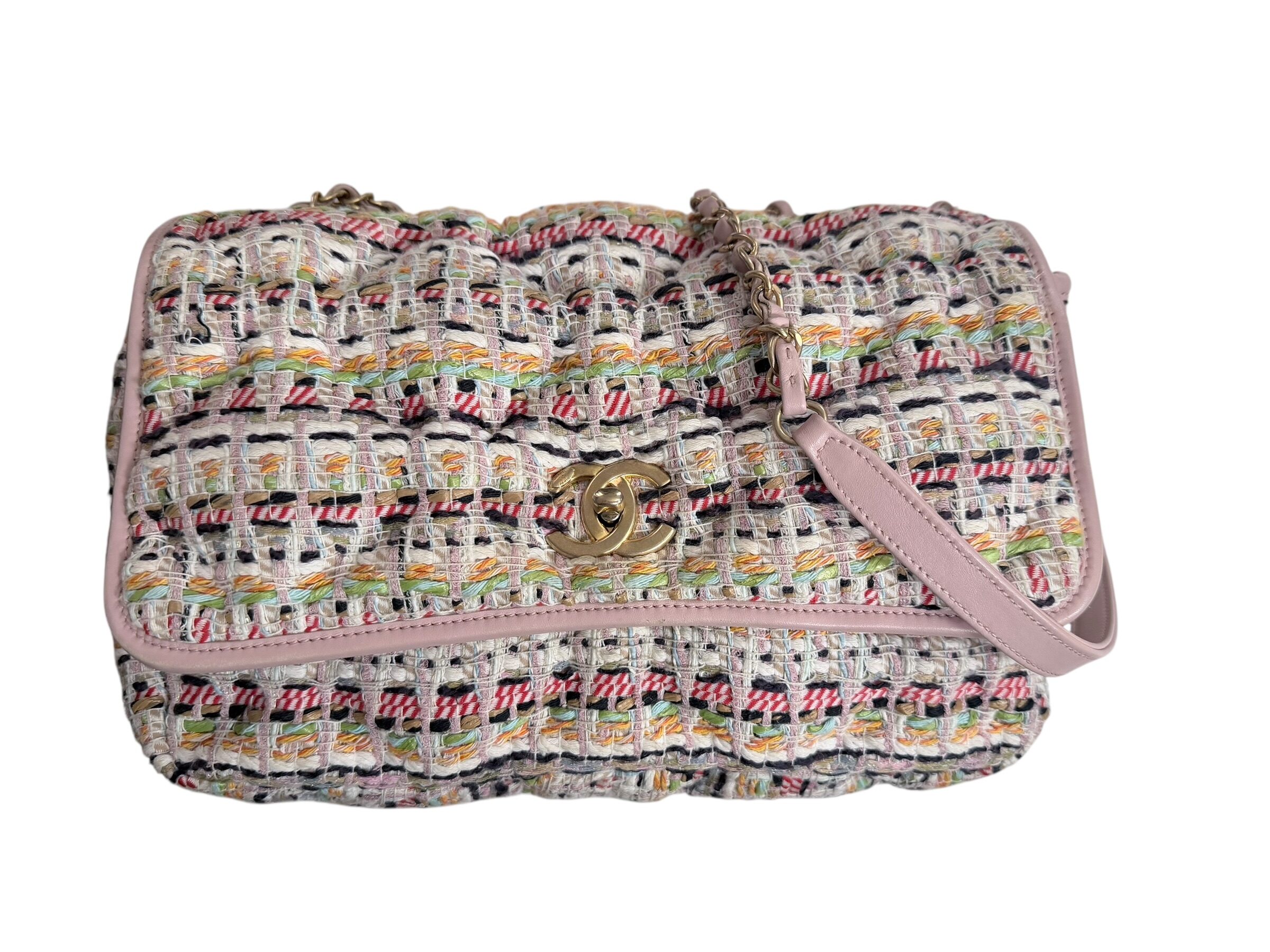 This Chanel bag is a springtime and ultra-feminine interpretation of the iconic Classic Flap bag. It abandons the traditional leather for a textured multicolored tweed (mixing tones of cream, yellow, green, and coral). The design is accentuated by pastel pink lambskin borders, which elegantly structure the flap and the edges of the bag. The iconic codes are present: the rotating CC clasp in golden metal and the shoulder strap in intertwined golden chain and pink leather. This model is an ideal collector's piece for those looking for an original and textured alternative to the black leather model.