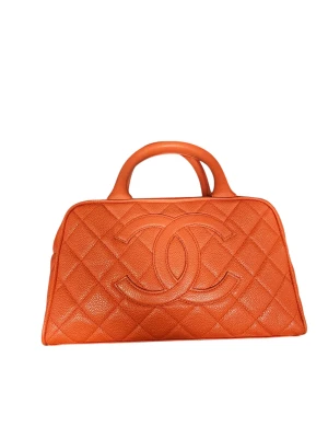CHANEL Pre-Owned 2003 Bowling 27 Bag Made in: France Highlights circa 2003 Orange Caviar leather Diamond quilting iconic CC quilting two handles Back pocket Zipper at top Main subject Interior zip pocket Logo patch on the inside Metal feet gold-colored fittings The bag is outside in excellent condition but inside has a stain ( see photo) Dimensions 25×15×10cm