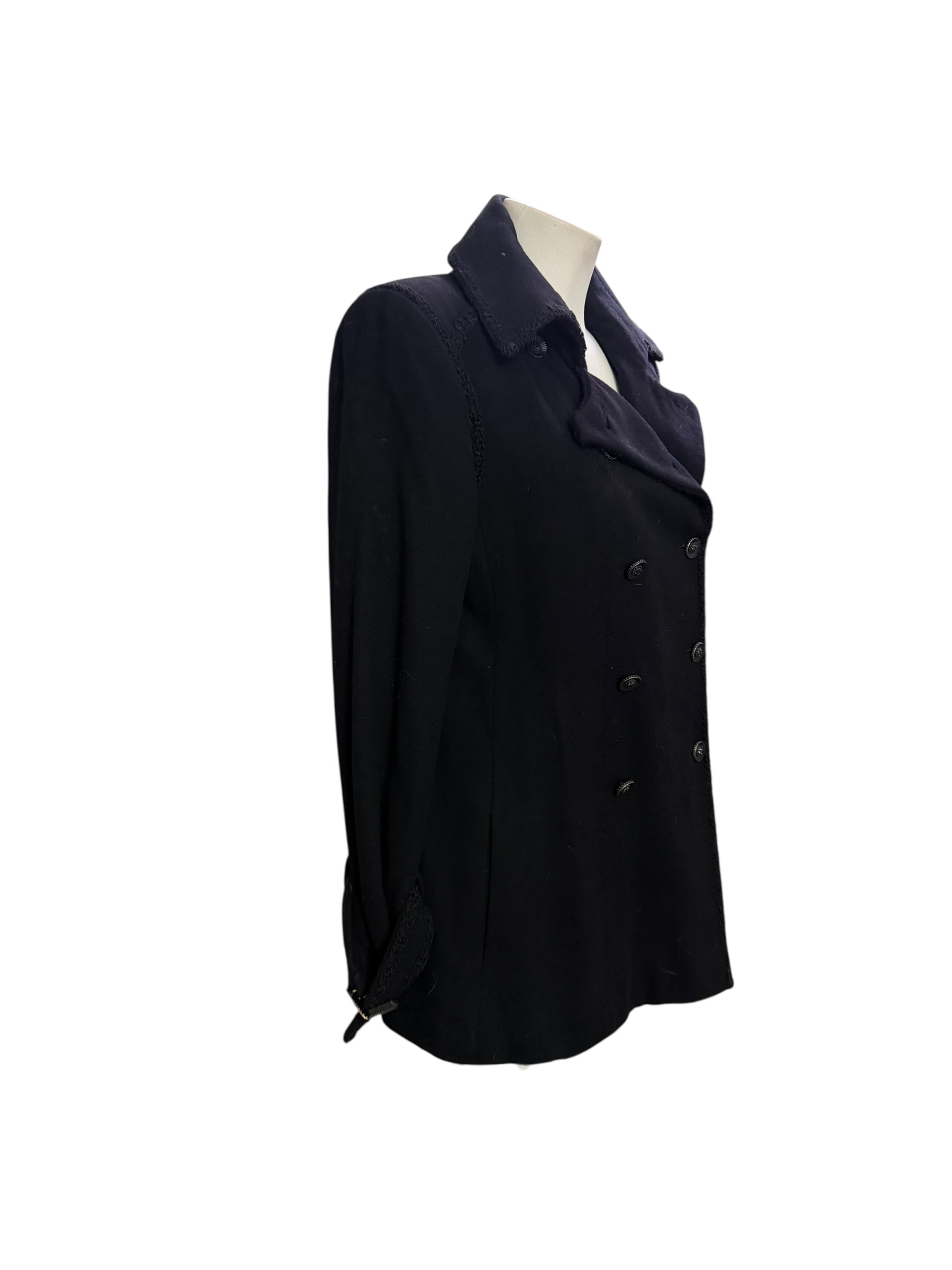 Coat by Chanel in black cashmere with a structured and elegant cut. This model features a classic tailored collar and a double-breasted closure adorned with Chanel logo metal buttons. The shoulders are slightly structured, giving the coat a sharp and sophisticated silhouette. The sleeves are embellished with a decorative tone-on-tone cashmere tab, held by a rectangular engraved metal buckle, adding a distinctive and elegant detail. Both chic and easy to wear, this Chanel coat is a timeless piece, emblematic of the craftsmanship of the Chanel house.