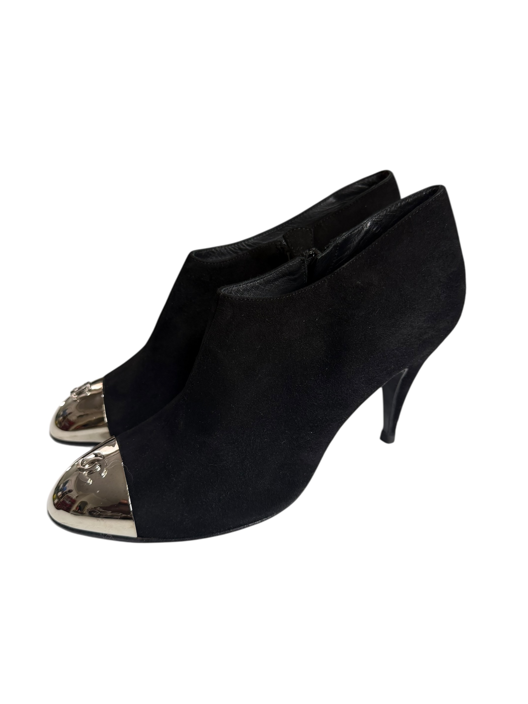 These Chanel pumps are a centerpiece of the Chanel House, combining the classicism of suede with a decidedly modern touch. Crafted in a very fine black suede, they feature a pronounced "V" cut on the instep that elongates the leg while offering sophisticated support. The distinctive detail lies in the silver metal toe cap, engraved with the iconic logo of intertwined double "C"s. This contrast of materials between the matte suede and the brilliance of the silver metal gives this pair a luxurious and timeless look. These shoes are ideal for enhancing both a cocktail outfit and a more urban and structured ensemble.