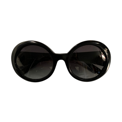 Adopt a glamorous and timeless look with these Chanel sunglasses. Their round and wide frame in shiny black acetate is a classic from the house, inspired by vintage chic. The smoked lenses offer effective sun protection and a sophisticated look. The temples are adorned with the iconic "CC" logo in golden metal, which adds a touch of discreet and recognizable luxury.