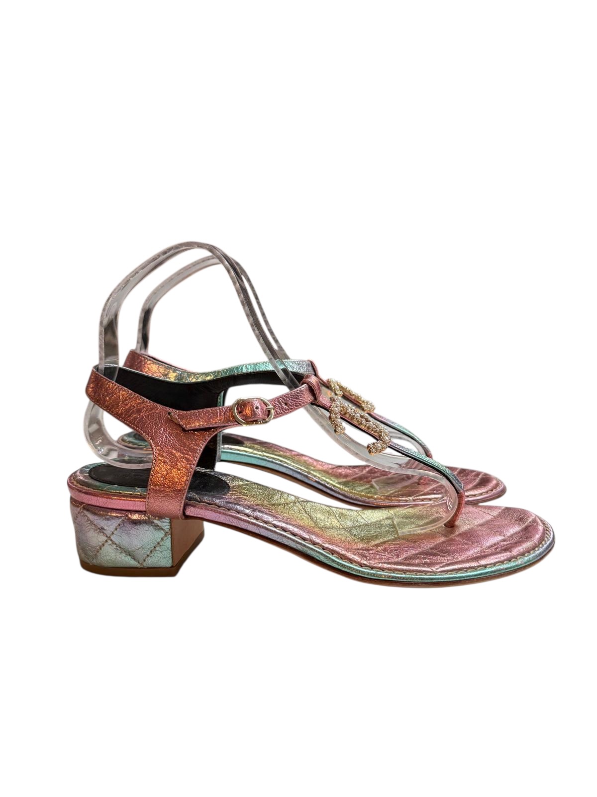 These Chanel sandals are an exceptional piece combining fantasy and iconic codes of the House. The design stands out with its "T" strap adorned with a CC logo set with crystals and fantasy pearls, bringing a shine to the instep. The small block heel and the edge of the sole feature an iridescent finish with holographic reflections, engraved with the iconic quilted diamond motif of Chanel. The closure with a delicate golden buckle at the ankle ensures a perfect fit, while the quilted insole guarantees the characteristic comfort of the House's shoes.