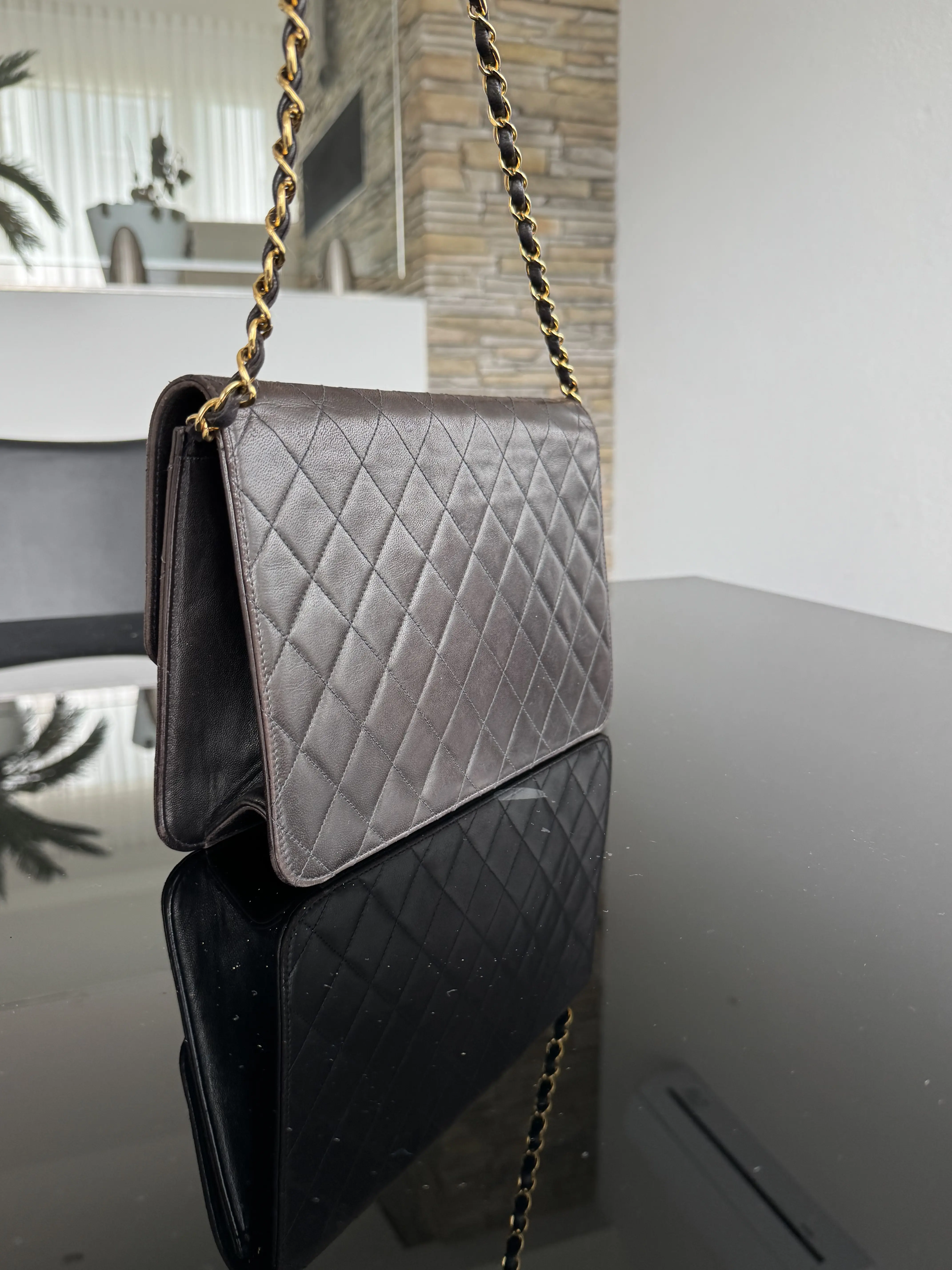 Wunderschöne dunkelbraune Chanel Single Flap mit 24k vergoldeter Hardware. Ein Vintage Stück aus ca. 1995. Die Tasche wurde sorgsam gebraucht und hat durchgehend ganz feine Kratzer, die nur bei gutem Hinschauen auffallen. Innen ist sie fast neuwertig. Die Kette ist "kurz" (nicht als Crossbody zu tragen). Diese schöne Tasche ist insgesamt in sehr gutem Vintage Zustand. Code-Etikette drin, Authentizitätskarte und Entrupy Zertifikat vorhanden.