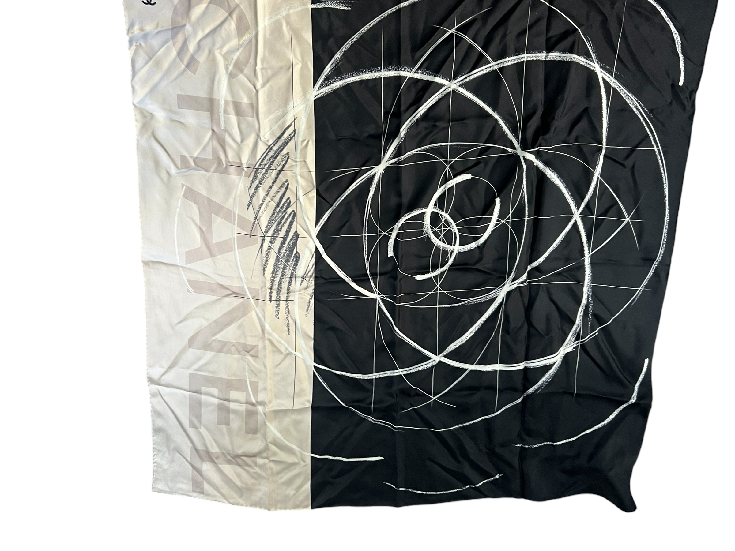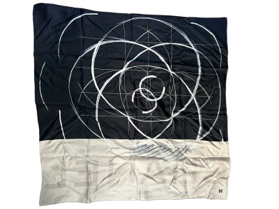 Discover an exceptional piece with this square Chanel scarf, a true wearable work of art. Crafted from exquisite silk, it stands out with an abstract and graphic motif, evoking a stylized camellia flower, drawn in white on an intense black background. The lower part, in an off-white shade, adds an elegant contrast, on which the name "CHANEL" is discreetly inscribed in watermark, asserting its identity without ostentation.