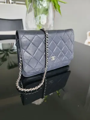 Chanel Wallet on Chain in midnight blue. Das Täschchen hat Abrieb/ Gebrauchsspuren an den Ecken (siehe Bilder). Die Lederstelle um den Druckknopf ist durch den Gebrauch etwas locker geworden, hält aber und hat keine Risse. Das Leder ist allgemein in sehr gutem Vintage-Zustand, d.h. es ist anmutig gealtert, hat aber keine Risse oder Striemen.