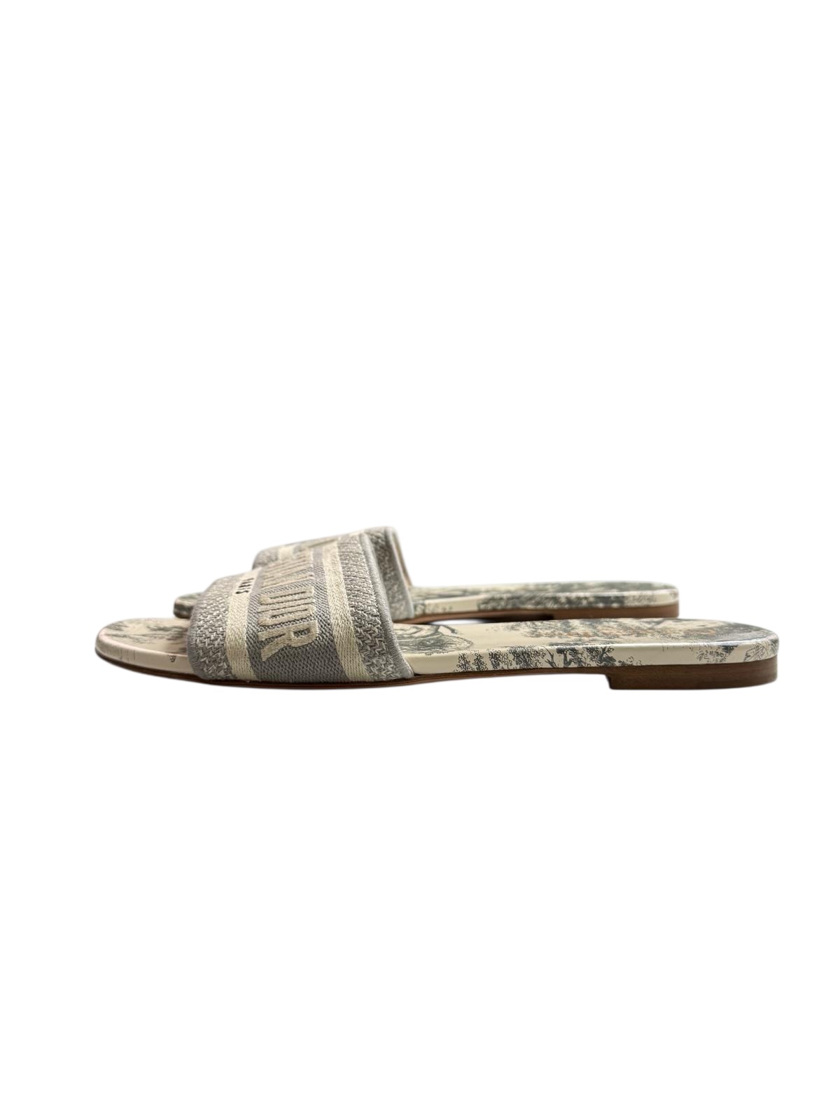The Dior Dway mules are an iconic and timeless piece from the House, offering a casual look while maintaining couture elegance. This model is made of gray and white embroidered cotton, adorned with the Wild Toile de Jouy motif, a modern reinterpretation of Dior's historical code. The upper strap is stamped with the embroidered "CHRISTIAN DIOR PARIS" signature in capital letters, immediately recognizable. With a thin leather sole, these flat mules are the ultimate summer accessory, easy to slip on to perfect an elegant and summery silhouette.