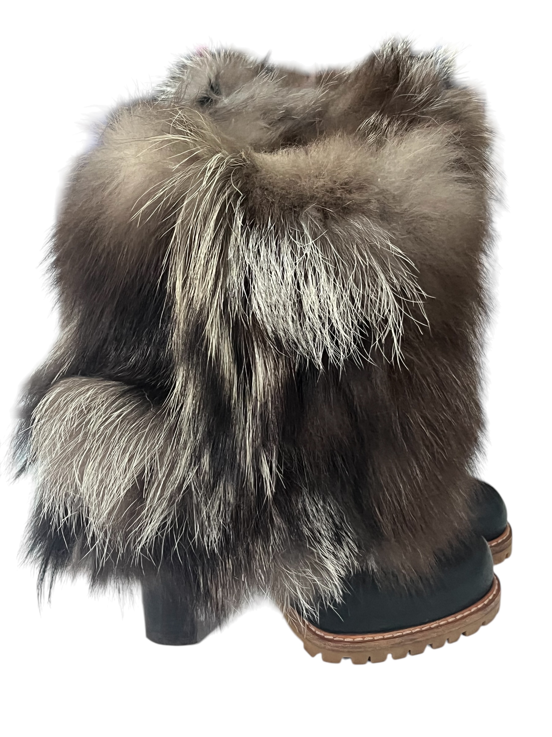 Black leather ankle boots, characterized by a bold and luxurious design. The body of the shoe is simple, but it is topped with thick and fluffy fur in brown and gray tones, which extends up the ankle. The heel is wide and made of wood, and the grooved sole provides an interesting contrast with the fur.