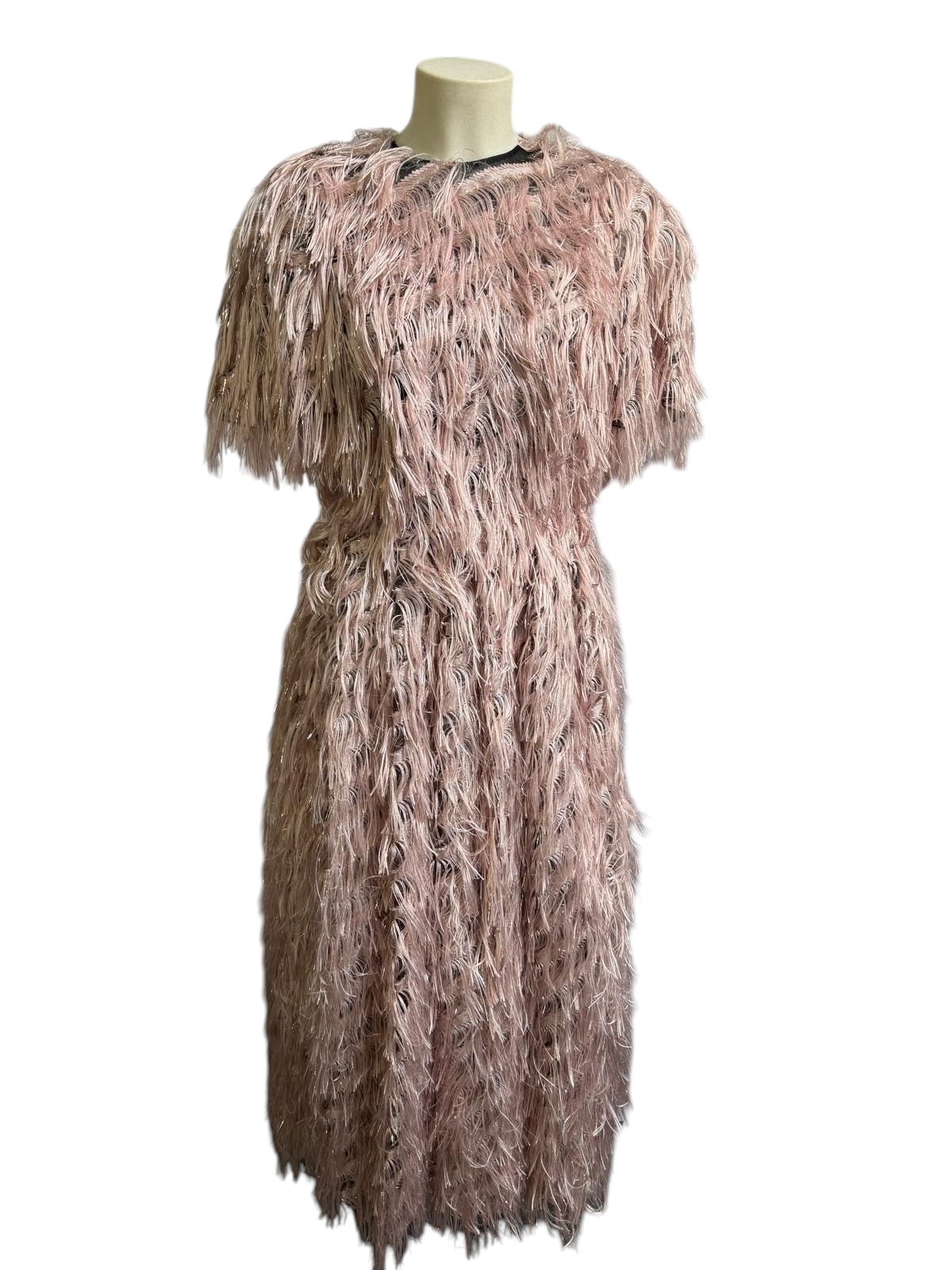 This dress is a true work of art, entirely covered with delicate pink fringes/feathers. The texture is airy and light, creating a fascinating movement with each step.