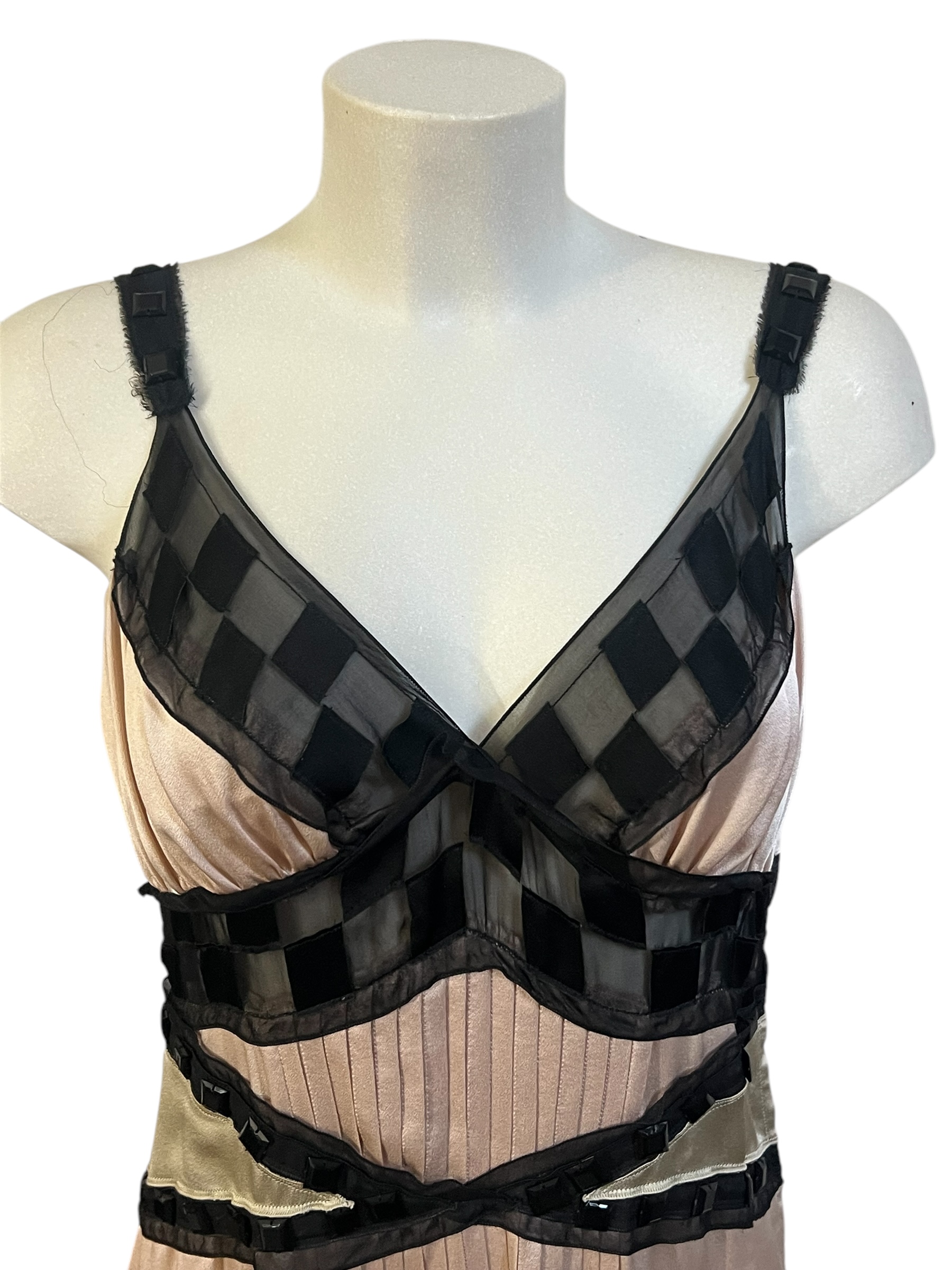 This Alberta Ferretti dress is a must-have piece in your wardrobe. Its bodice, draped in black chiffon with checkered pattern, contrasts with the nude silk of the bodice for a look that is both bold and romantic. The waist is elegantly defined by a play of pleats and crossed ribbons, while the fluid bottom, adorned with delicate pleats, promises graceful movement with every step.