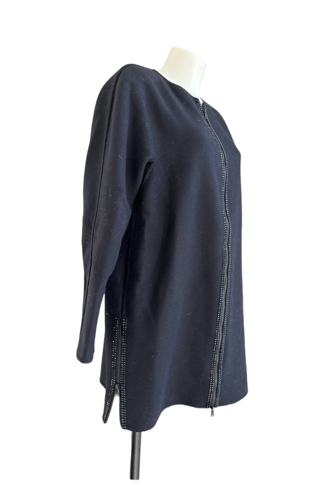 The distinctive detail of this piece lies in its front zipper closure, adorned with small rhinestones, adding a touch of brilliance and sophistication. The long sleeves and clean lines make it a versatile piece, easy to wear with jeans, a dress, or tailored pants.
