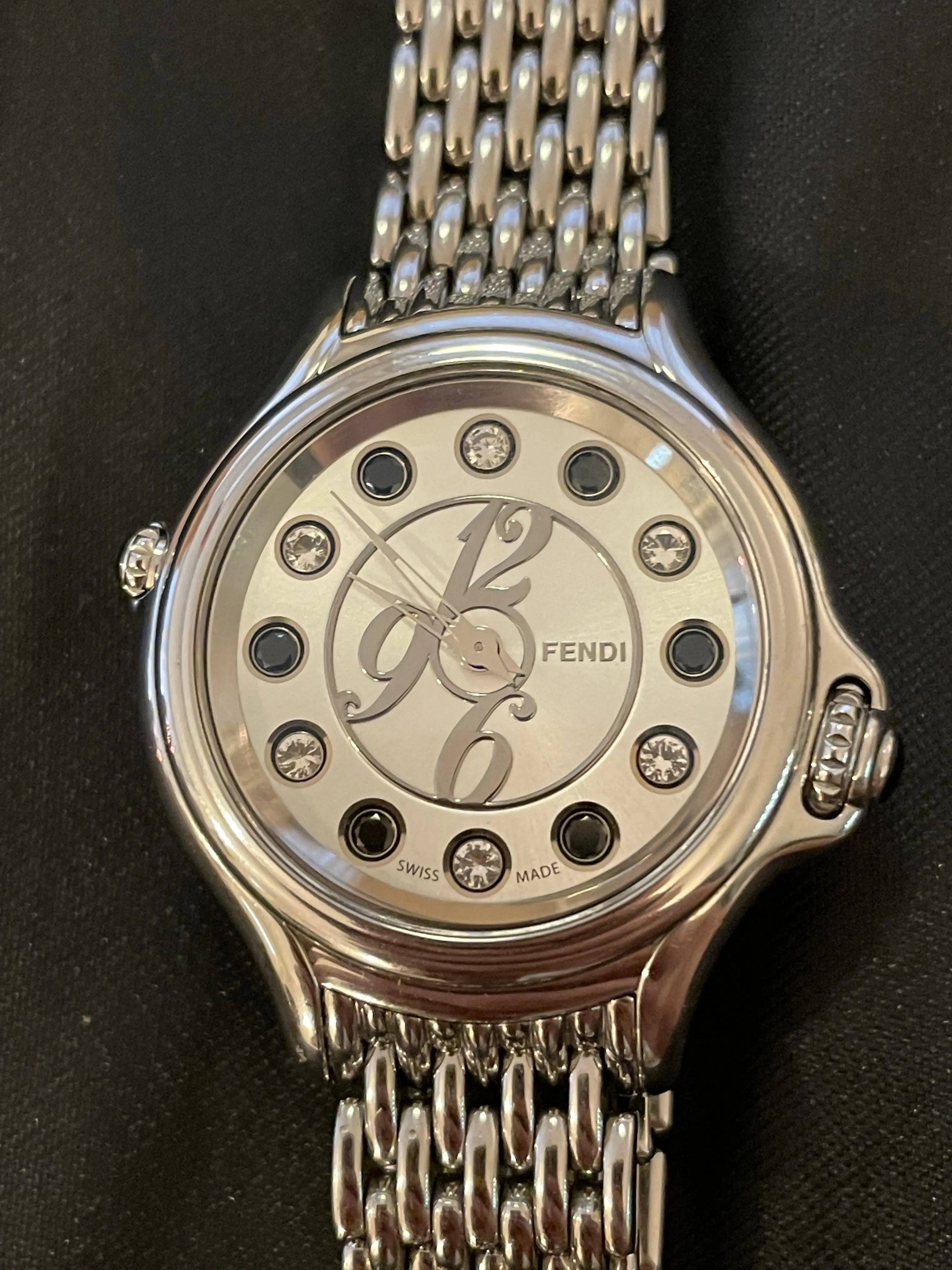 Lightly used Fendi Crazy Carat Watch with 3 Stone Settings. The 12 o’clock fixed Stone is q real white Diamond. The Settings are: - Rainbow, all Topaz Stones - Black & White, the white Stones are Topaz, the black Stones are Spinel - all red, all Topaz Stones The Change of the Stones works by turning the Crown manually. The Material of the Watch and the Bracelet is stainless Steel. The Watch is Quarz, Made in Switzerland The Lenght of the Bracelet is roughly 14,5cm.