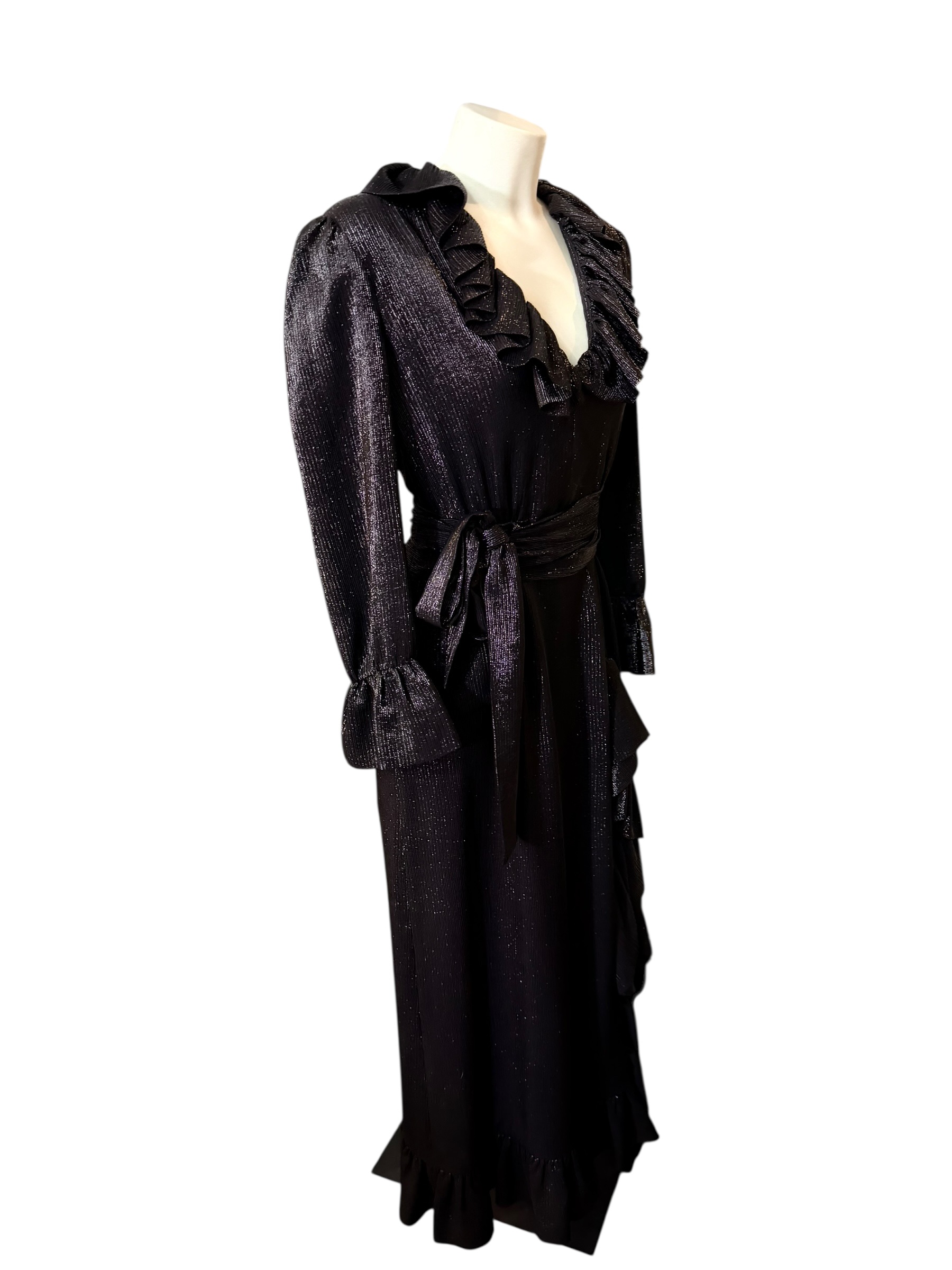 This Gucci dress is a spectacular piece that captures the essence of romantic and sophisticated glamour of the Italian fashion house. Crafted from high-quality black silk with silver sequins, it subtly captures the light. The design features a timeless wrap silhouette, flattering for all body types, that ties at the waist with a wide coordinating belt. The deep "V" neckline and cuffs are enhanced by elegant ruffled flounces, adding dramatic volume and a modern Victorian touch to the ensemble. The long skirt is also trimmed with ruffles along its entire length, creating a fluid and airy movement with each step. This dress is the embodiment of assertive luxury, perfect for a gala evening or prestigious event.
