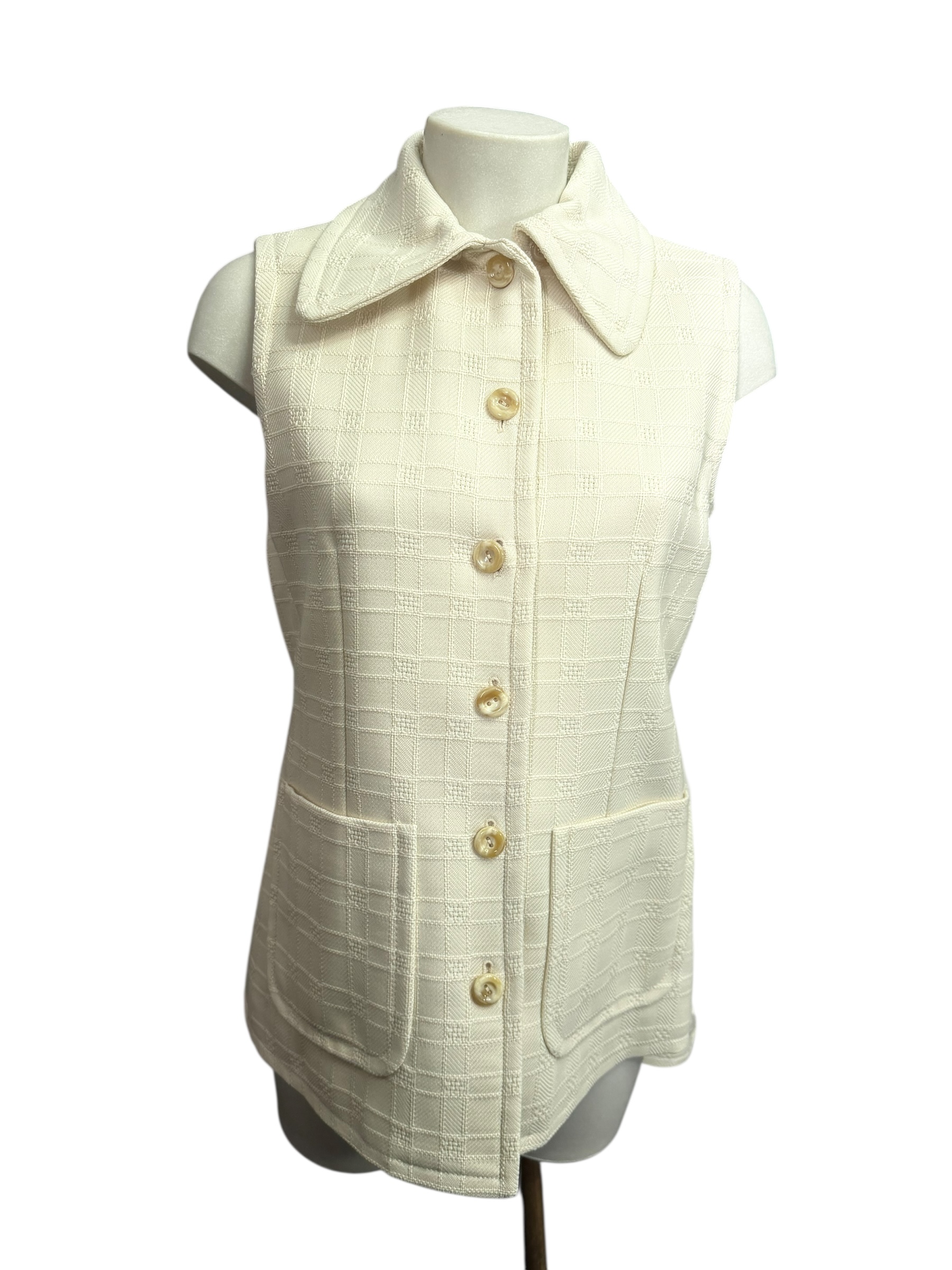 This Gucci vest, a sleeveless blazer version, stands out with a structured and elegant silhouette that revisits tailoring codes with a contemporary approach. Crafted in a textured material in a bright ivory hue, it features a fitted cut that delicately emphasizes the bust line while maintaining a refined and timeless look.