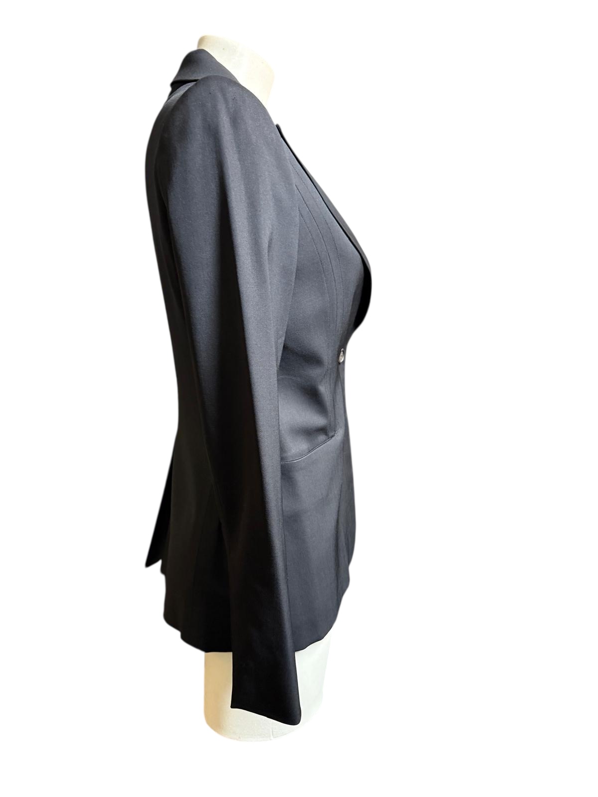 This Gucci jacket embodies the modern elegance of Italian tailoring, where precision cuts meet a sophisticated and understated aesthetic. Crafted from a structured material in a deep black hue, it features a fitted silhouette that accentuates the waist and elegantly highlights the bust line.