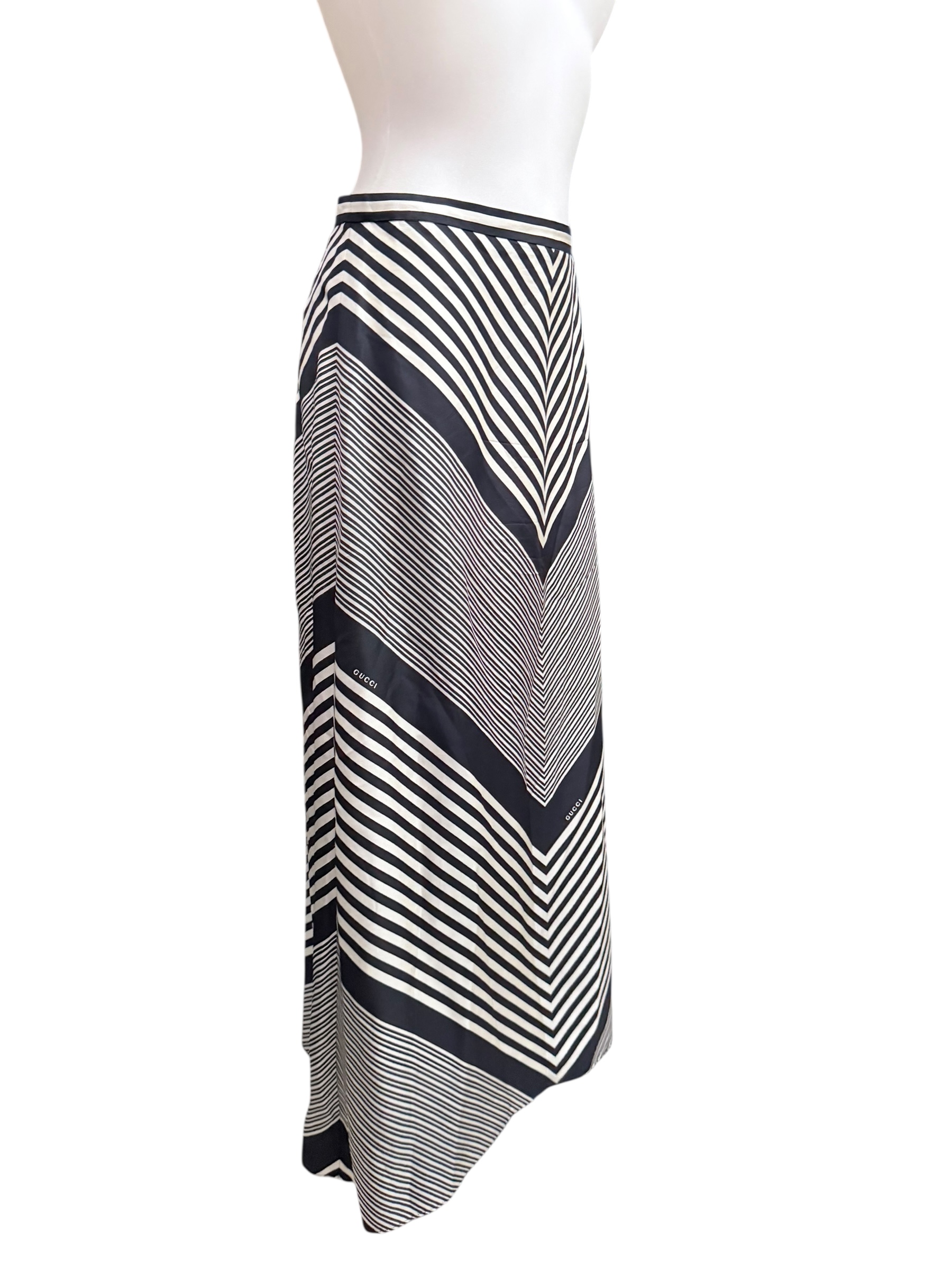 This Gucci skirt is a masterful piece that plays with contrasts and optical illusions. It stands out with a bold chevron (zigzag) pattern, featuring black and white stripes.