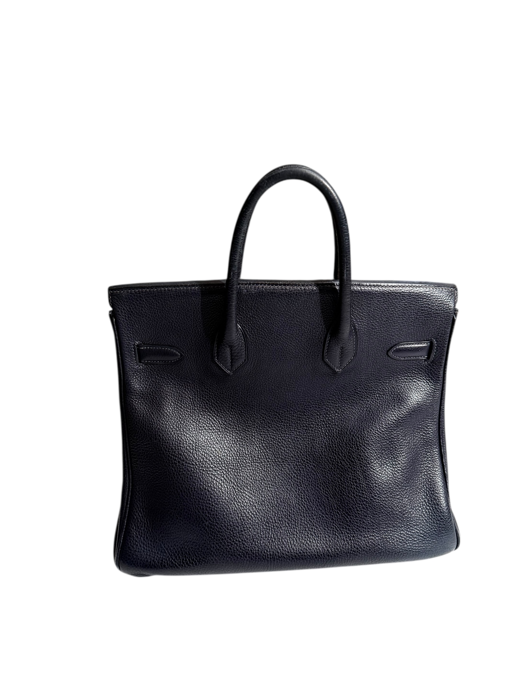 The Hermès Haut à Courroies (HAC) bag is the elder statesman of Hermès leather goods, originally designed in the 19th century to carry saddles and riding boots. This size 32 version is a rare collector's piece, prized for its taller and narrower proportions than the classic Birkin, giving it an air of absolute elegance. Crafted in navy blue Togo leather, a grained calfskin known for its suppleness, scratch resistance, and exceptional longevity. The bag features its famous closure, enhanced by palladium-plated silver metal hardware. The spacious interior is a tribute to functional luxury, capable of accommodating all your essentials with distinction. Whether for daily use or as an investment piece, this navy blue HAC 32 is the epitome of timeless and unisex chic. Stamp Square E.