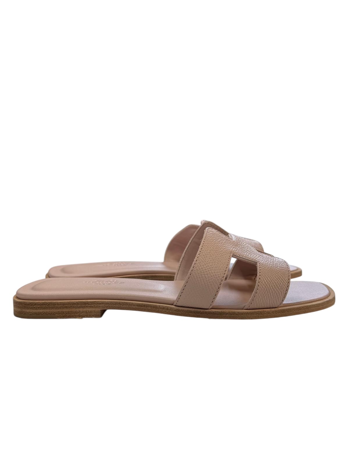 The Hermès Oran sandals are the absolute icon of the House, an essential piece of any summer wardrobe that transcends decades without ever losing its elegance. This model is recognizable among a thousand thanks to its cutout leather in the shape of a capital "H," the brand's iconic signature. Crafted from high-quality calfskin leather, they are presented here in a powdery pink hue, ideal for elongating the leg and matching all your seasonal outfits. With their flat natural leather sole and sleek design, they offer a perfect blend of comfort and discreet luxury.