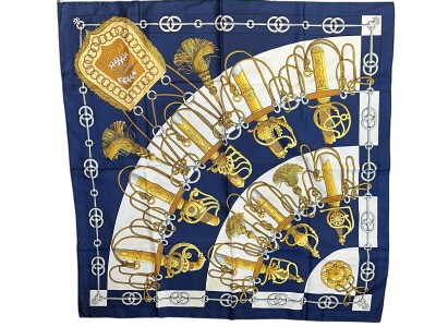This magnificent 100% silk square from Maison Hermès features the famous equestrian motif "Bits & Bridles" on a deep navy blue background. The design showcases an elegant array of golden bits, stirrups, and reins subtly intertwined with fine chains on a bright ivory background. The border, adorned with geometric patterns reminiscent of buckles and halters, perfectly frames this iconic scene. Its silk, with unparalleled richness and fluidity, offers exceptional draping.