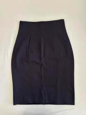 Marineblauer Jerseyrock mit hoch angesetztem Bund. Sehr chic und figurbetont. Auf Bauchhöhe in der Naht eine eingearbeitete Tasche. Knielang mit Futter. Rock ist wenig getragen, Leider ist am Saum das Futter eingerissen, lässt sich aber bestimmt reparieren. Bundbreite liegt bei 40 cm, Hüftbreite bei 50 cm