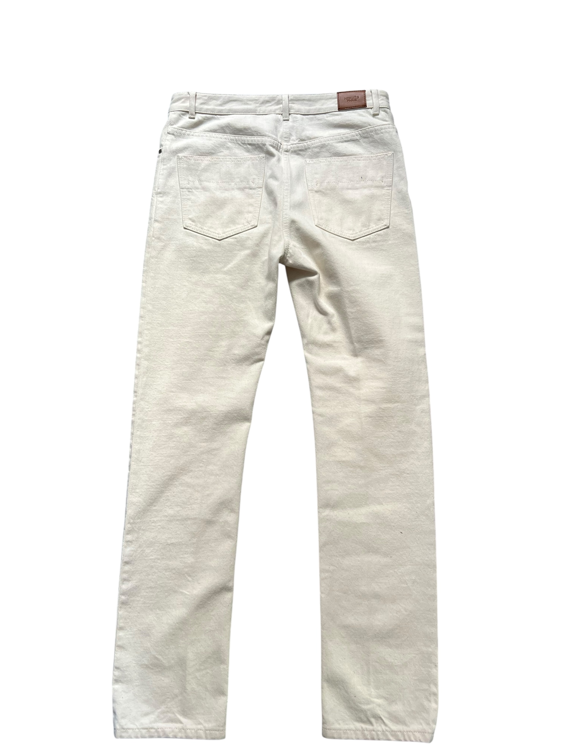 This Hermès jeans is the embodiment of discreet luxury and casual elegance typical of the House. Crafted from high-quality cotton denim, it features a bright and versatile off-white hue, perfect for a summer or mid-season wardrobe. The cut is a classic straight fit, offering a timeless silhouette that flatters all body types. At the back, you can find the House's signature with a leather label embossed with the Hermès logo. It is a luxury basic piece that combines durability and extreme refinement.
