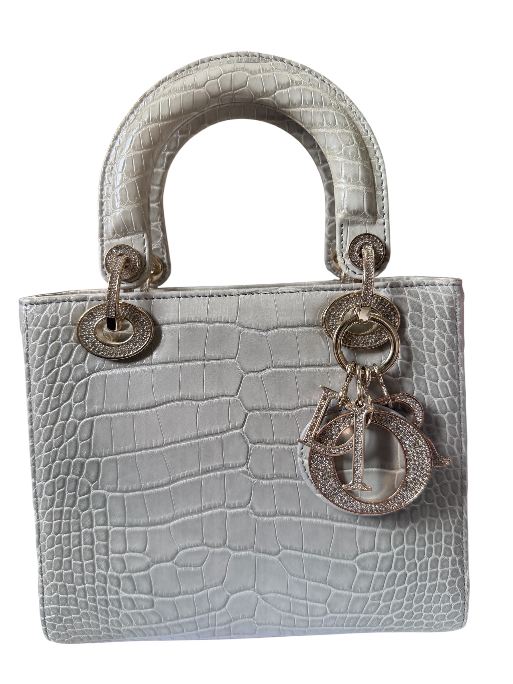 This Lady Dior bag is the absolute embodiment of Dior's Haute Maroquinerie, a exceptional piece intended for the most demanding collectors. Made of genuine crocodile leather, its light gray matte finish enhances the exotic texture while maintaining a discreet and modern elegance. All the iconic features of the model are present: the rigid and rounded top handles, the matching exotic leather shoulder strap, and the "D.I.O.R" charms reimagined with rhinestones. This Small size model is perfect for complementing a gala outfit or an ultra-sophisticated daytime ensemble. This Lady Dior bag is sold with a dust bag, invoice, and CITES.