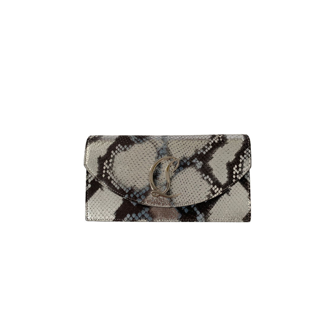 This Christian Louboutin shoulder bag is an exotic and elegant piece, designed for an evening look. It comes in the form of a flap clutch, with a snake pattern in shades of gray, white, and black, embellished with silver highlights.