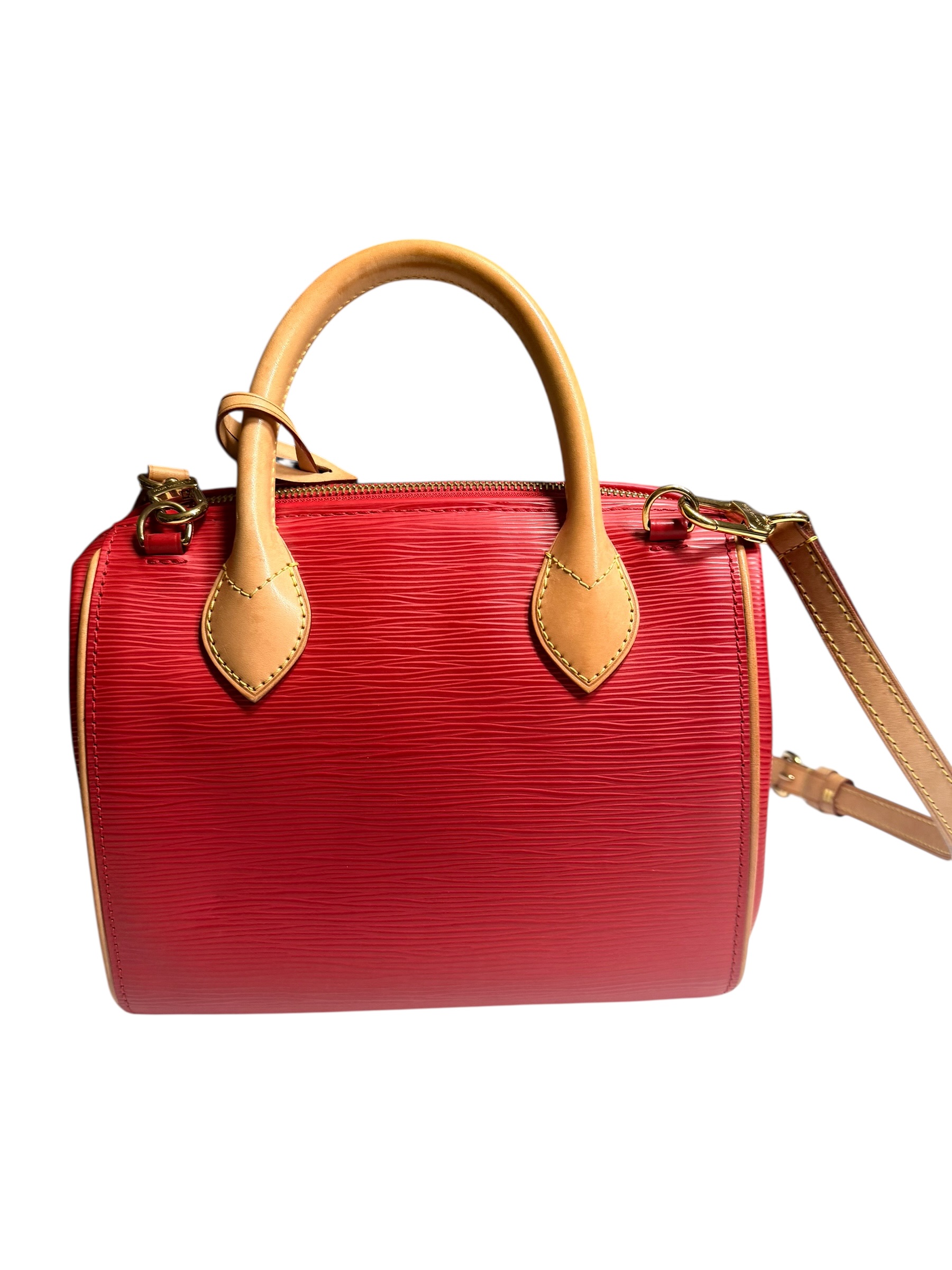 This Louis Vuitton "Doc" bag is a piece of leather goods with architectural elegance, perfect for those who appreciate structured and timeless silhouettes. It contrasts two iconic materials of the House: the robust and textured red Epi leather, and the natural cowhide leather, which borders the contours of the bag and forms its handles. Its rigid "bowling" shape offers impeccable hold, with its unique zipper closure on top. The contrast between the vibrant red and the natural leather gives this bag a unique "Sport-Chic" look. It has a single handle and a removable shoulder strap in natural leather for shoulder or crossbody wear. The gold metal finishes and matching key bell complete this sophisticated model.