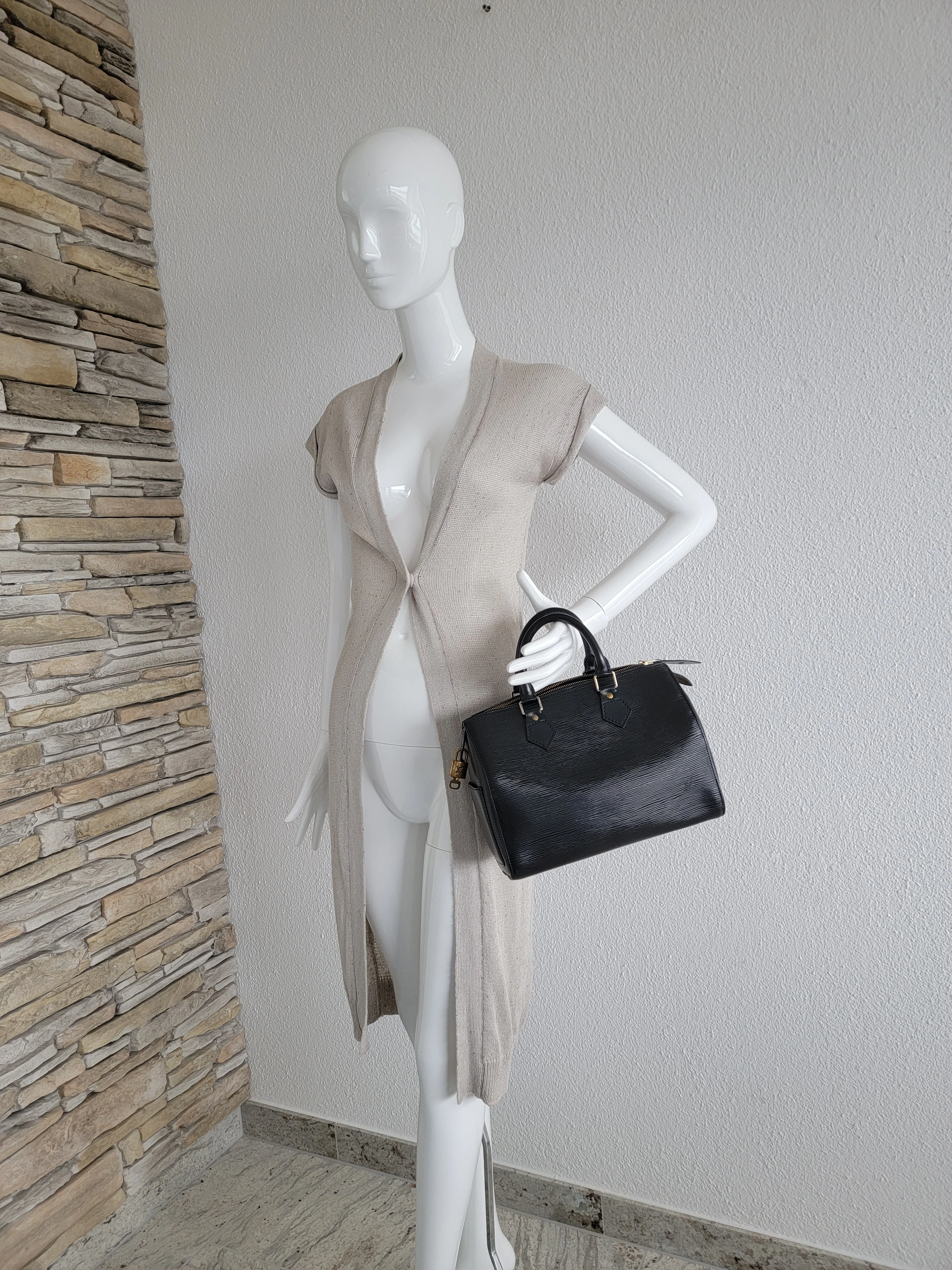 Sehr hübsche und gut erhaltene kleine Louis Vuitton Speedy 25 in Epi Leder. Das Leder ist an mehreren kleinen Stellen leicht matt, dies ist aber nur bei bestimmtem Lichteinfall sichtbar. Kleine Flecken im Innenraum. Allgemein sehr schöner Vintage Zustand. Der Schulterriemen ist neu, aber ein No-Name Artikel.