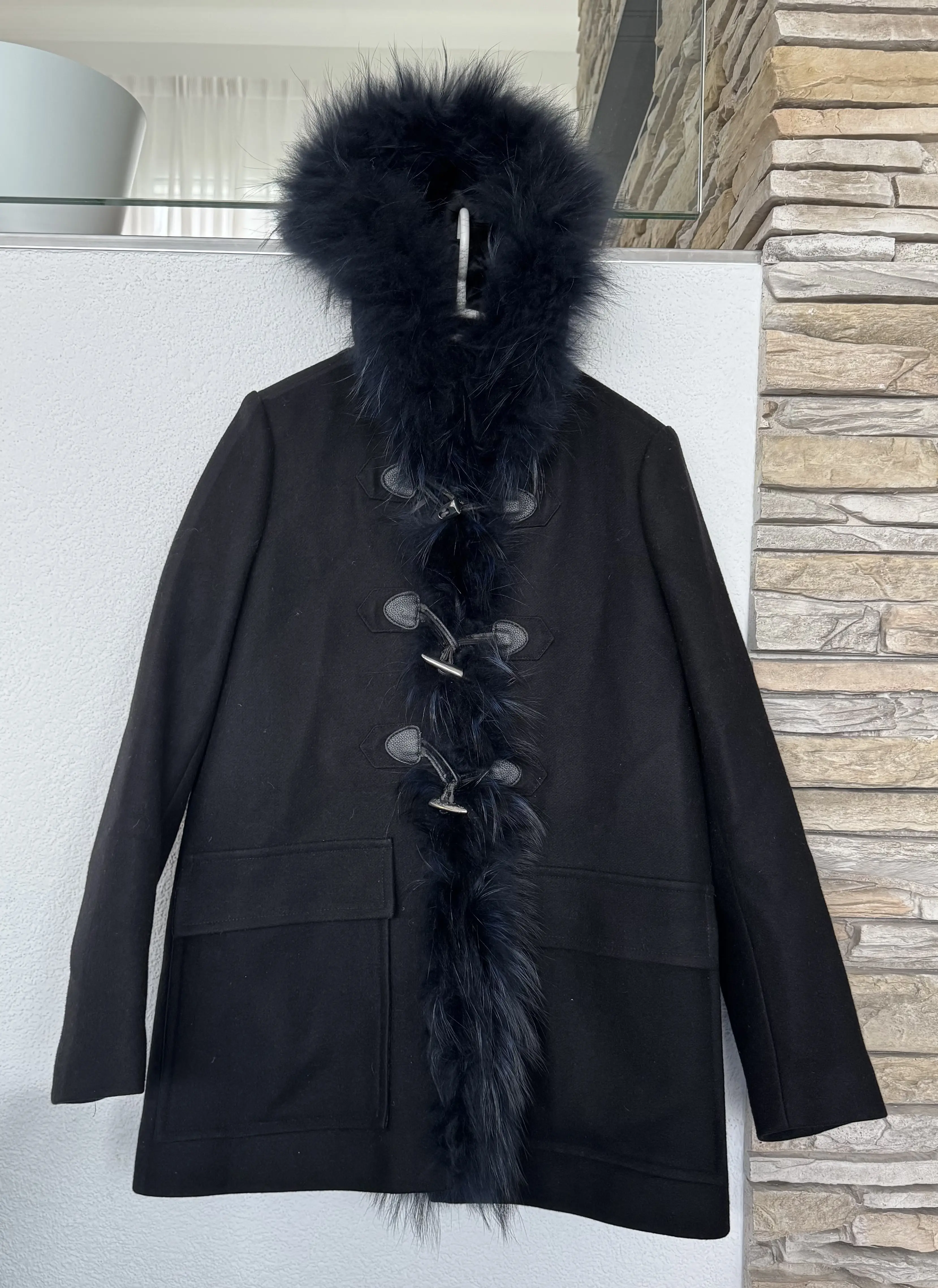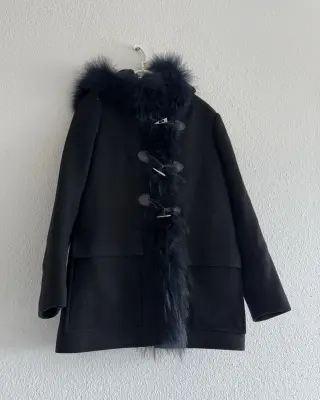 Schöner, sehr warmer Kurzmantel von Maje mit Echtpelz Besatz. Der Mantel ist warm gefüttert. Einziger Makel sind die Abnutzungen an den Knopfösen (siehe letzte 2 Bilder), die man ganz "abschälen" könnte.