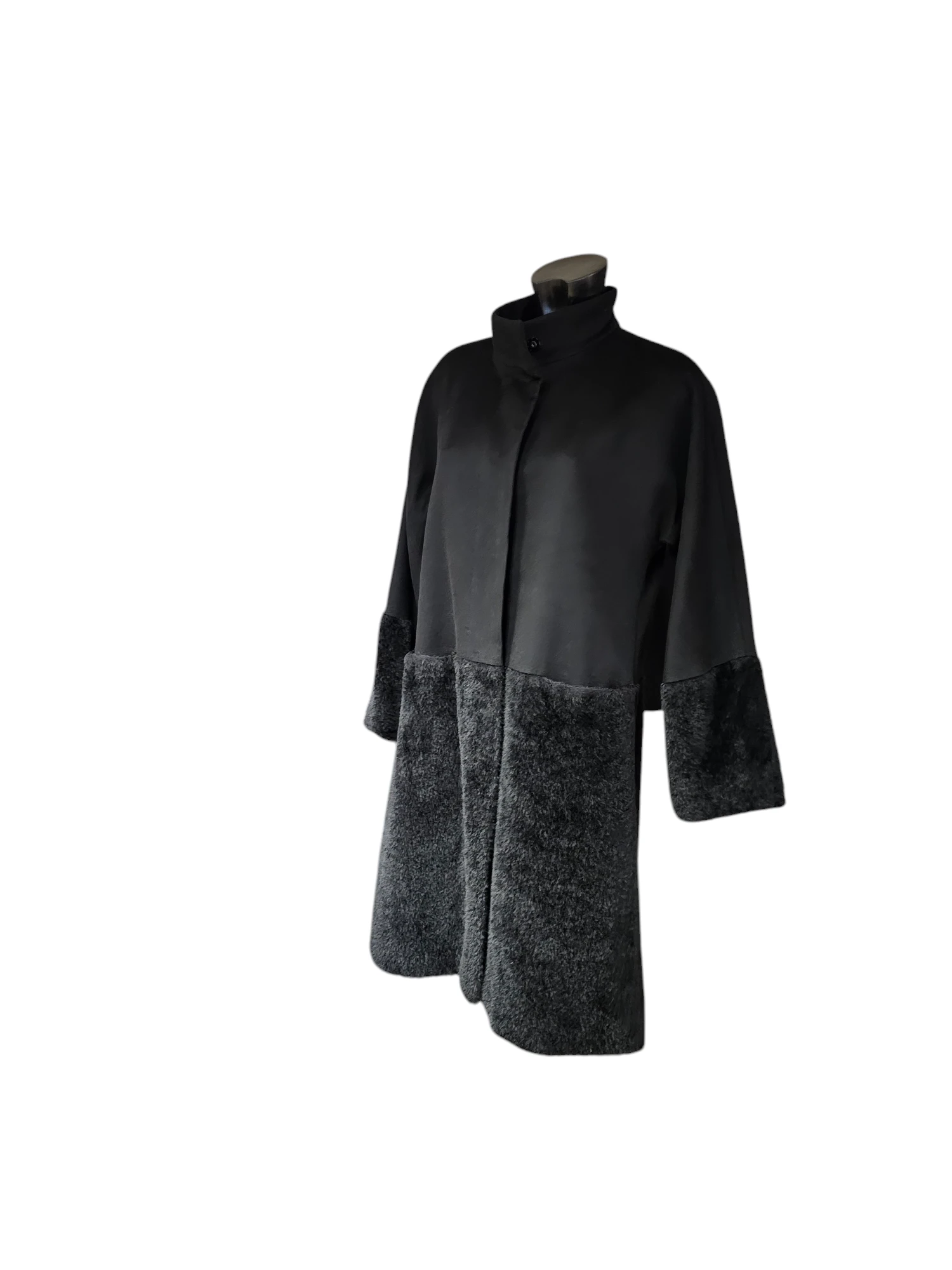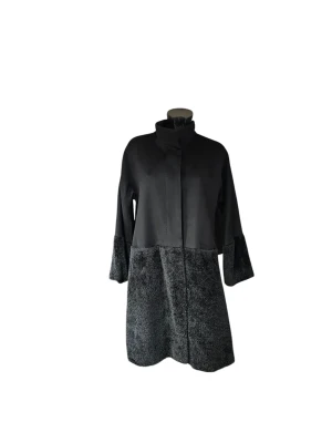 Stylish Max Mara Studio black winter coat, size 38, made in Italy. This elegant coat features a unique design with soft, warm fur on the lower part. It is perfect for the cold season and will keep you warm and fashionable. The coat is used but in good condition. Wool/ Alpaca Size 38 Length 97cm Cheest width 53cm