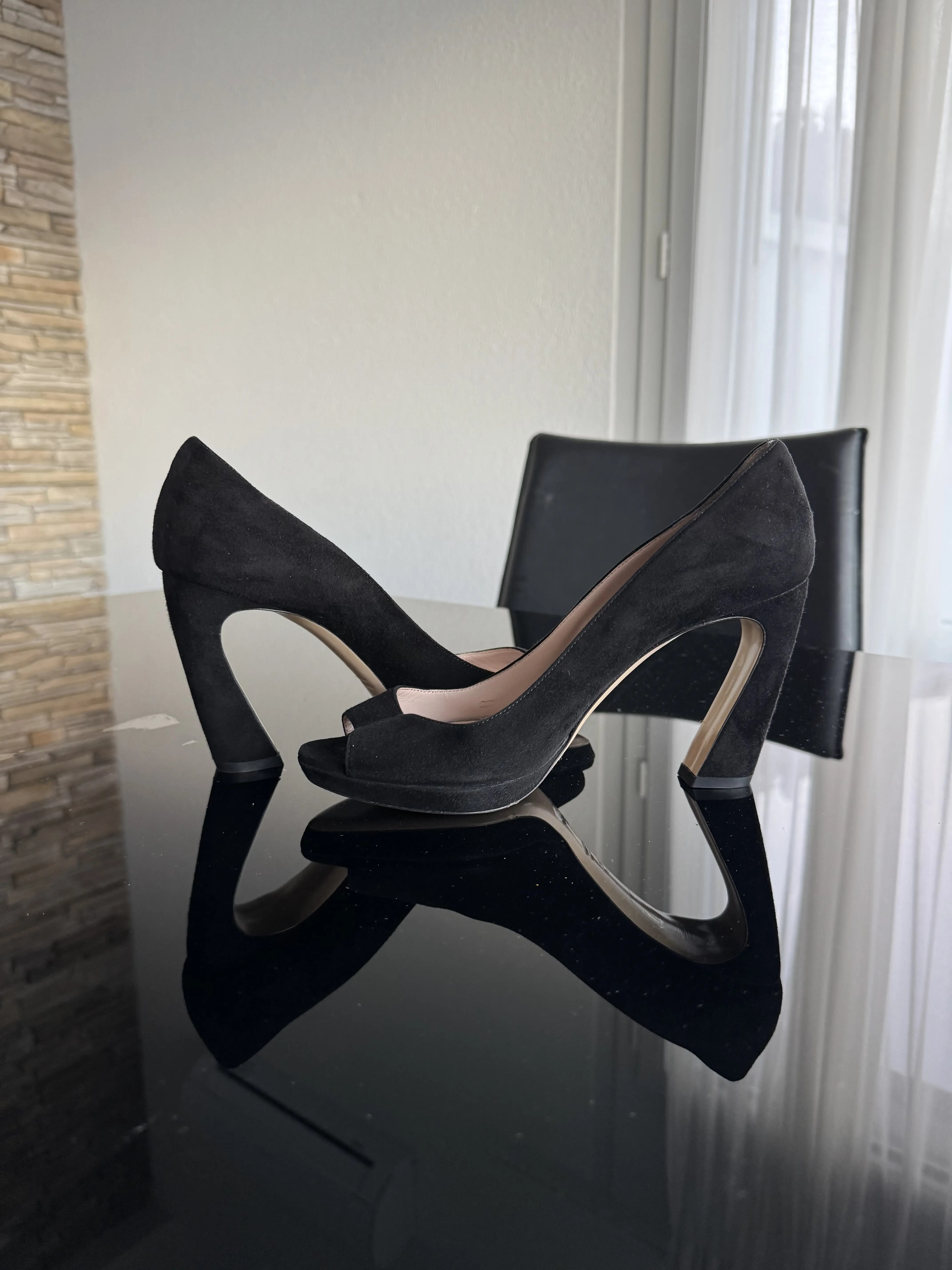 Sehr schöne Peeptoes aus Wildleder von Miu Miu. Einmal getragen, minimale Gebrauchsspuren, wie auf den Fotos ersichtlich. Neupreis fast 1000.-