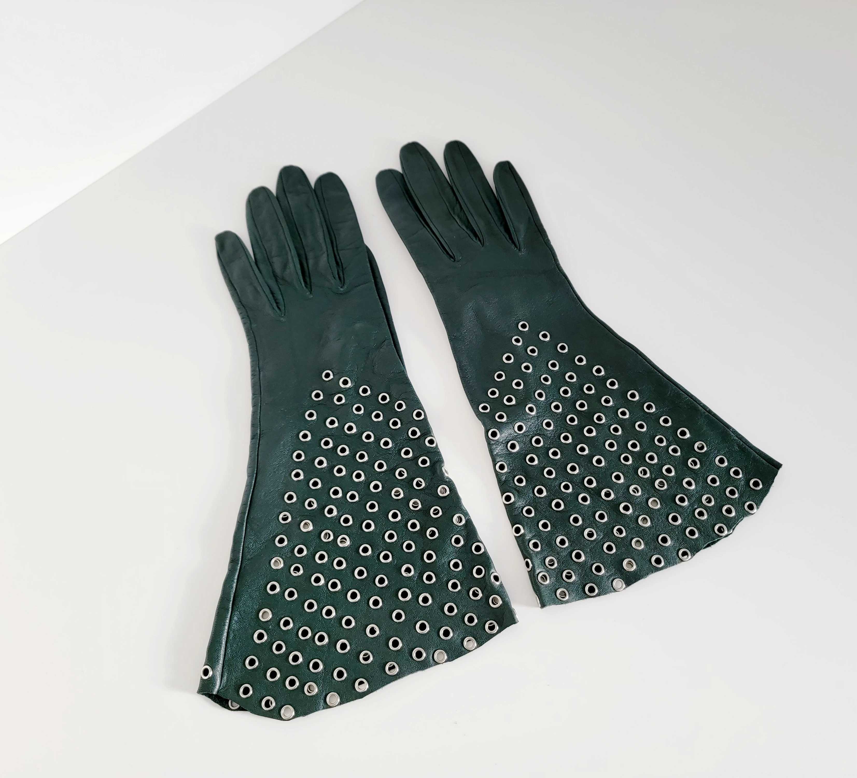 Neuwertige Alaïa Lederhandschuhe in dunkelgrün und mlt Ösen. Minimaler Fleck, kaum sichtbar, gemäss 7. Foto. Neupreis ca. 900.-