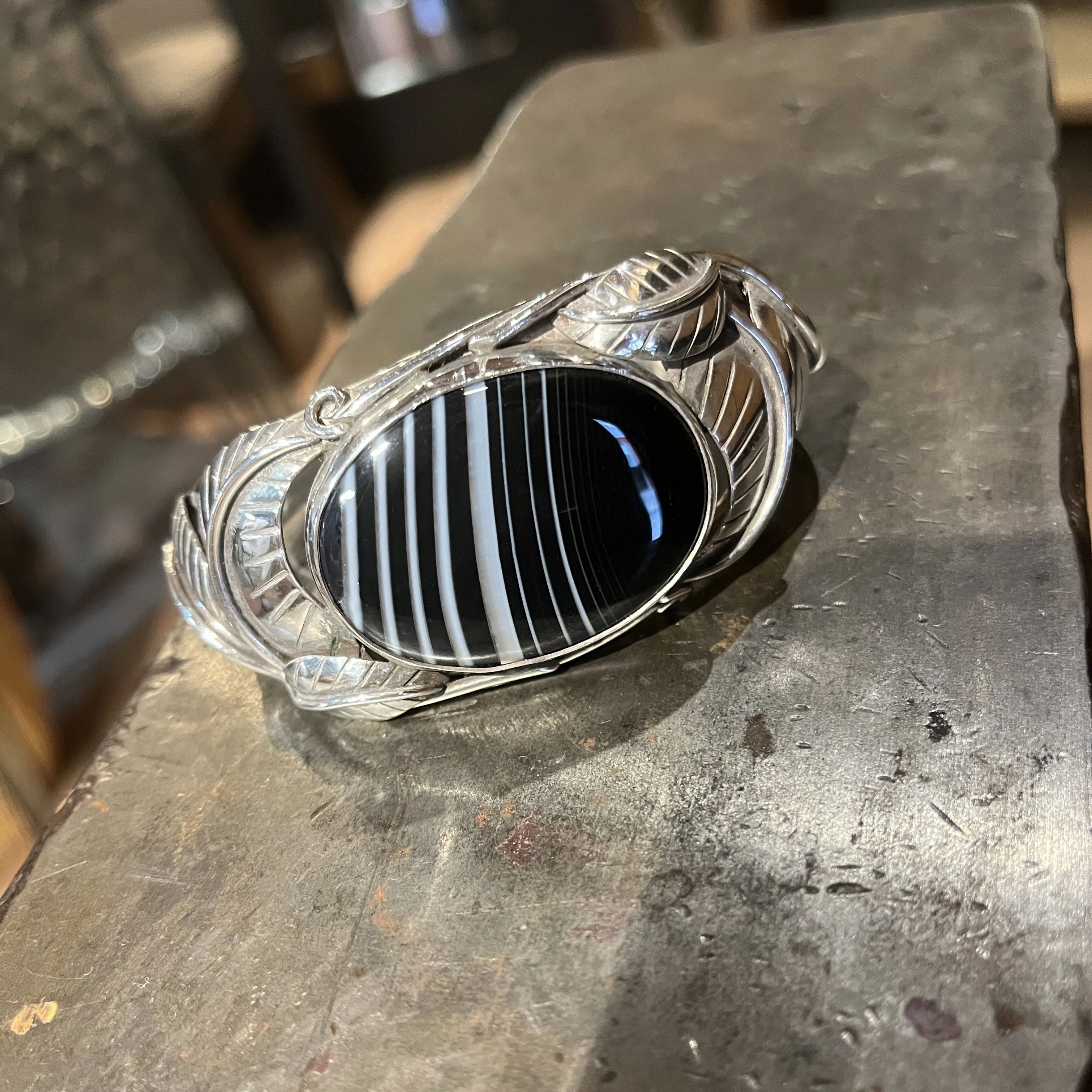 verkaufe wunderschönes, gebrauchtes Silberarmband mit geschmackvoller Musterung. Der Onyx ist in einem aufwendigen Silberreif eingefasst, welcher mit Details verziert ist. Das Armband ist zeitlos und passt zu jedem Anlass. Der Onyx ist in einem sehr guten Zustand, der Silberreif hat leichte Gebrauchsspuren. Unisex. Durchmesser 6 cm, Länge 15 cm. Sehr wenig getragen. Gekauft in einem coolen Laden (für Rockstars) in London. Neupreis CHF 1390.-