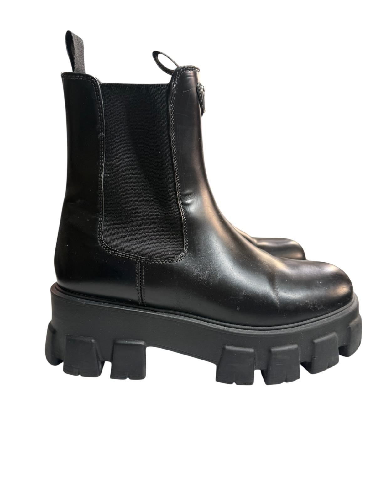 These Prada ankle boots from the Monolith line perfectly embody the contemporary and assertive aesthetic of the Italian fashion house. Crafted in brushed black leather, an iconic material of Prada known for its smooth and slightly shiny finish, they feature a sleek Chelsea silhouette that elegantly hugs the ankle. The design is marked by the famous Monolith sole, characterized by its imposing volume and geometric tread relief. This platform sole brings an architectural dimension to the shoe while reinforcing its modern and bold look. The contrast between the minimalist leather upper and the structured sole creates a distinctive balance, a signature of Prada's approach combining craftsmanship and avant-garde design. The elastic side panels allow for easy slip-on while maintaining the classic aesthetic of Chelsea boots. Both functional and decidedly contemporary, these Prada ankle boots stand out as a strong piece in urban wardrobes, capable of bringing character and modernity to an everyday silhouette.