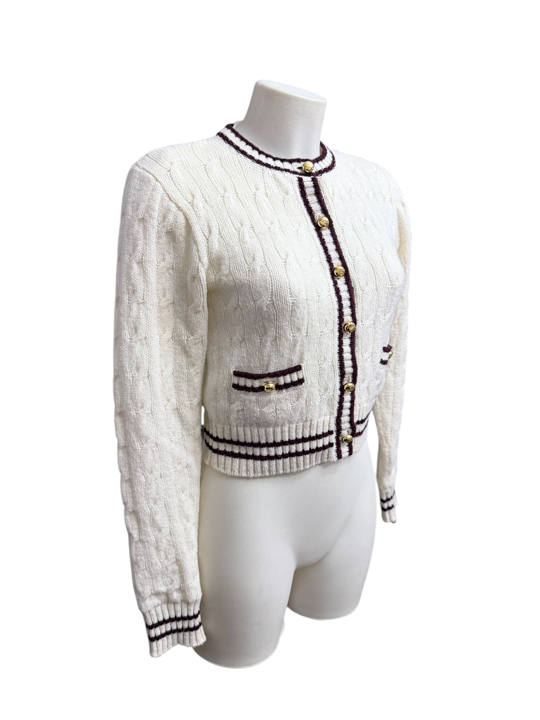This Prada sweater embodies the "preppy-chic" aesthetic with timeless elegance and remarkable attention to detail. The cardigan is crafted in a bright cream twisted knit, offering a rich texture and absolute comfort thanks to the exceptional quality of its weaving. Its fitted and slightly cropped cut modernizes the silhouette, making it an ideal piece to pair with both a pleated skirt and tailored pants.