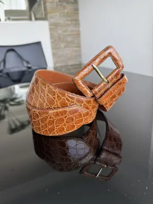 Vintage Gürtel aus Krokodilleder von Prada, 6cm breit. Das Leder hat einen leichten Glanz/ Patina über die Jahre hinweg bekommen. Die Schnalle hat ganz leichte Abreibungen gemäss Foto 3. Drei Löcher zum Verstellen für Taillen-Grösse S-M. Der Gürtel ist insgesamt in einem sehr guten Vintage Zustand.
