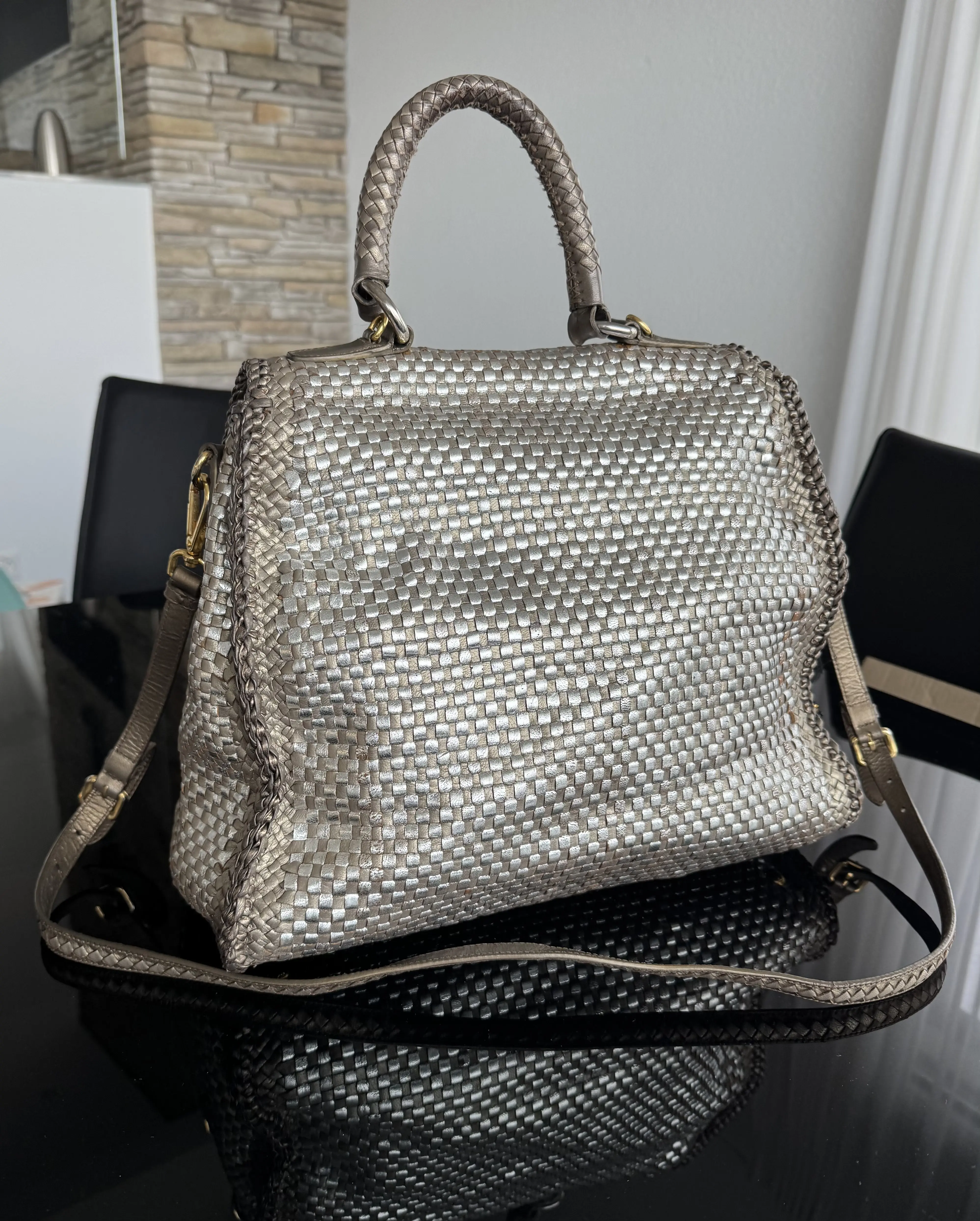 Mittelgrosse Prada Tasche, Modell "Madras". Die Tasche ist aus gold- und silberfarbigen Lederstreifen geflochten. Das Leder hat an wenigen Stellen feine Abnutzungsspuren (leichter Farb-Abrieb) gemäss Fotos. Insgesamt ist die Tasche in gutem, eher sogar sehr gutem Zustand.
