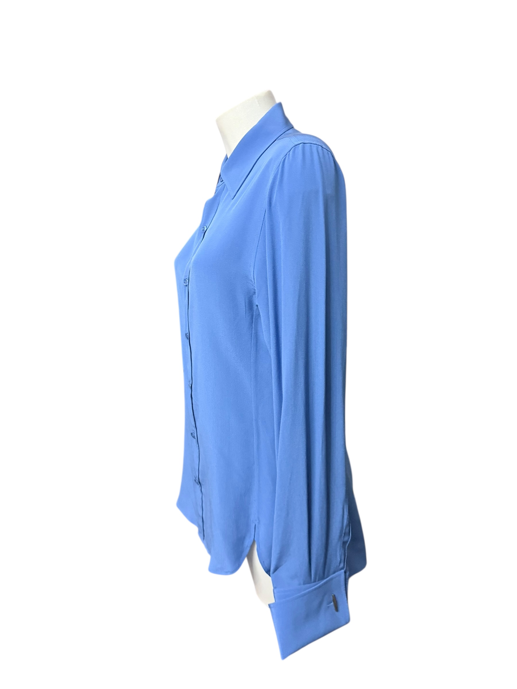 This Saint Laurent shirt is a centerpiece of the chic and minimalist wardrobe, perfectly illustrating the impeccable cut characteristic of the House. It is made of vibrant blue silk, a material that offers an elegant drape and absolute comfort throughout the day. The design stands out with its classic pointed collar and discreet button placket with tone-on-tone buttons for a clean finish. Its fitted yet fluid cut allows it to be worn either tucked into tailored pants or in a more casual way, making it a versatile and timeless essential.