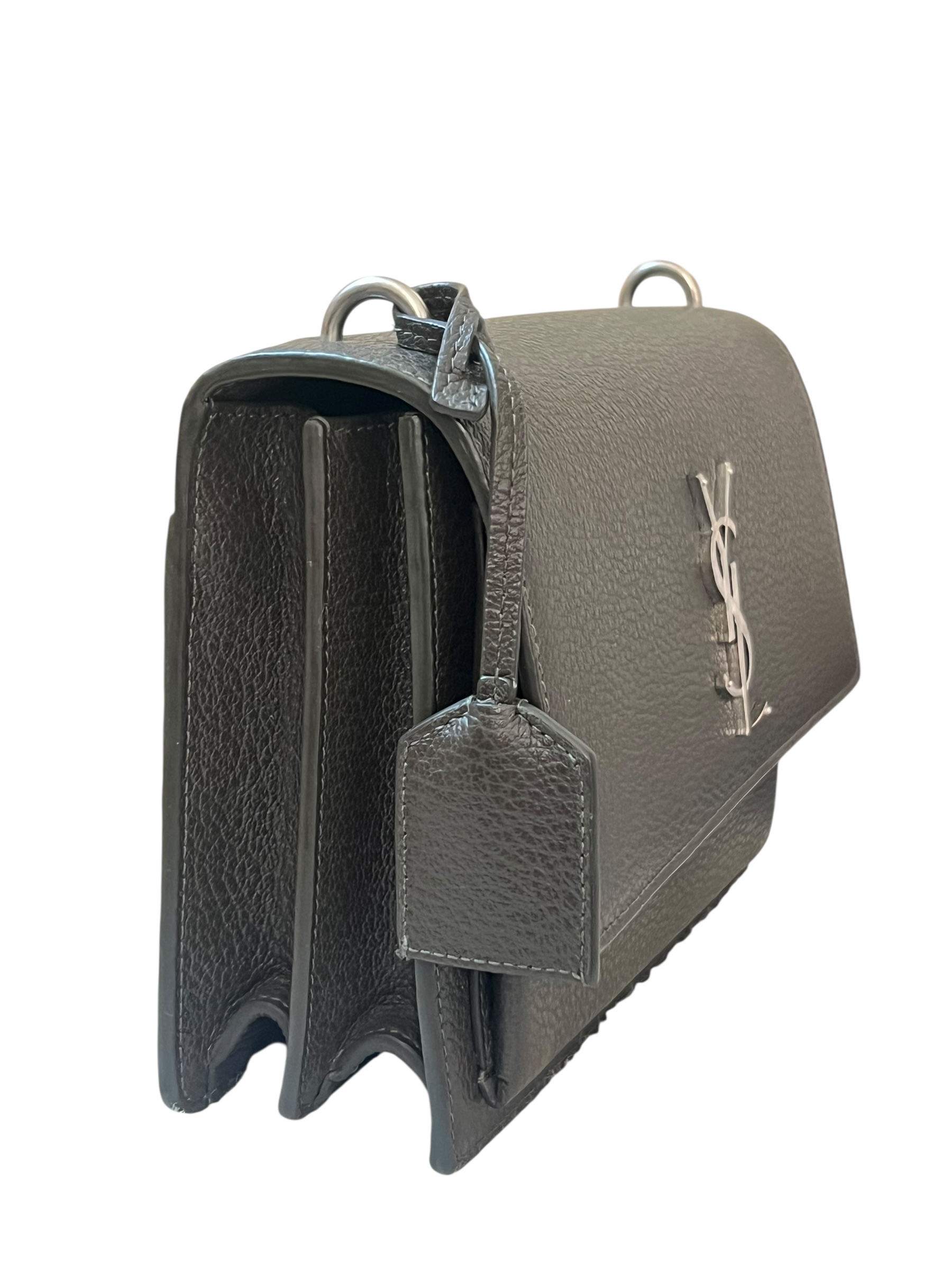 The Yves Saint Laurent Sunset bag is an icon of luxury leather goods, combining timeless elegance with modern functionality. This model is crafted from dark khaki calf leather, known for its high resistance to scratches and refined grain. The front is adorned with the iconic YSL logo in polished silver metal, adding a touch of sophisticated shine.
