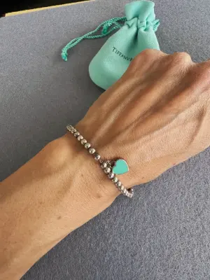 Tiffany Kugel-Armband mit Herz-Anhänger in Tiffany Blue. Feine Kratzer von Gebrauch und Aufbewahrung. Das Schmuckstück wurde professionell gereinigt und glänzt wie neu.Letztes Foto dient nur als Preisorientierung für heutige Modelle und ist nicht Bestandteil dieses Produktes.