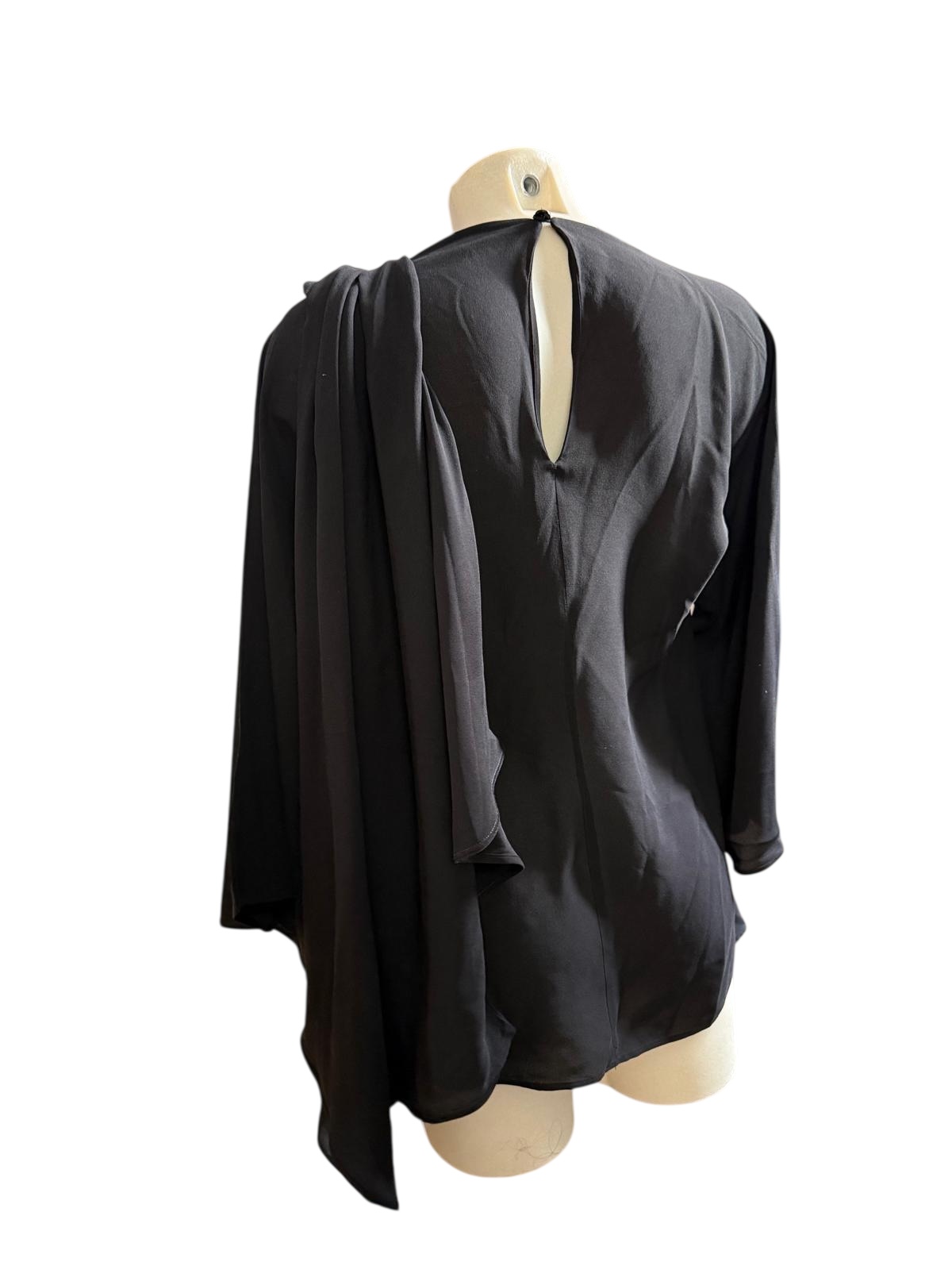 This Elie Saab top embodies the sculptural sophistication and fluid elegance characteristic of the Lebanese designer. Crafted from an exceptionally lightweight black silk crepe, it features asymmetrical draping on the front, creating an airy movement and a dynamic silhouette. The design stands out with its clean round neckline and fluid long sleeves. The key element lies in the integrated piece of fabric that extends into an elegant cape on one side, adding a dramatic and couture dimension to the piece. This timeless piece is ideal for enhancing a tailored trouser during a prestigious event or a formal evening.