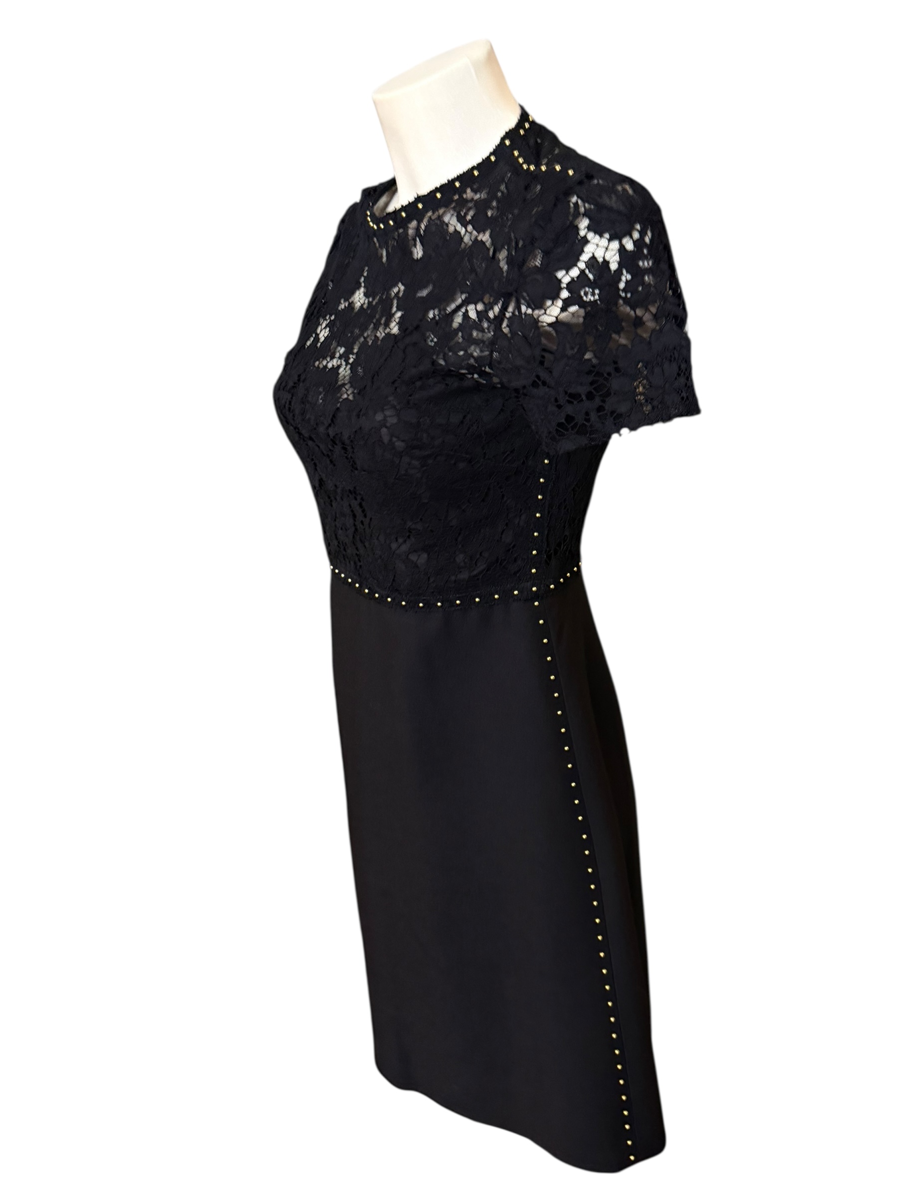 This Valentino dress is an exceptional piece. The design stands out with a bib and short sleeves in delicate floral lace, creating a sophisticated play of transparency on the upper bust and back. The transition between the lace and the structured fabric is emphasized by a row of golden micro studs, which also run along the waistline and side seams for a bold touch of modernity.