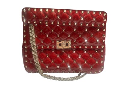 This bag is crafted in red patent leather, with diamond-shaped stitching. It is adorned with small champagne "Rockstud" studs on the stitching and along the edges of the bag.